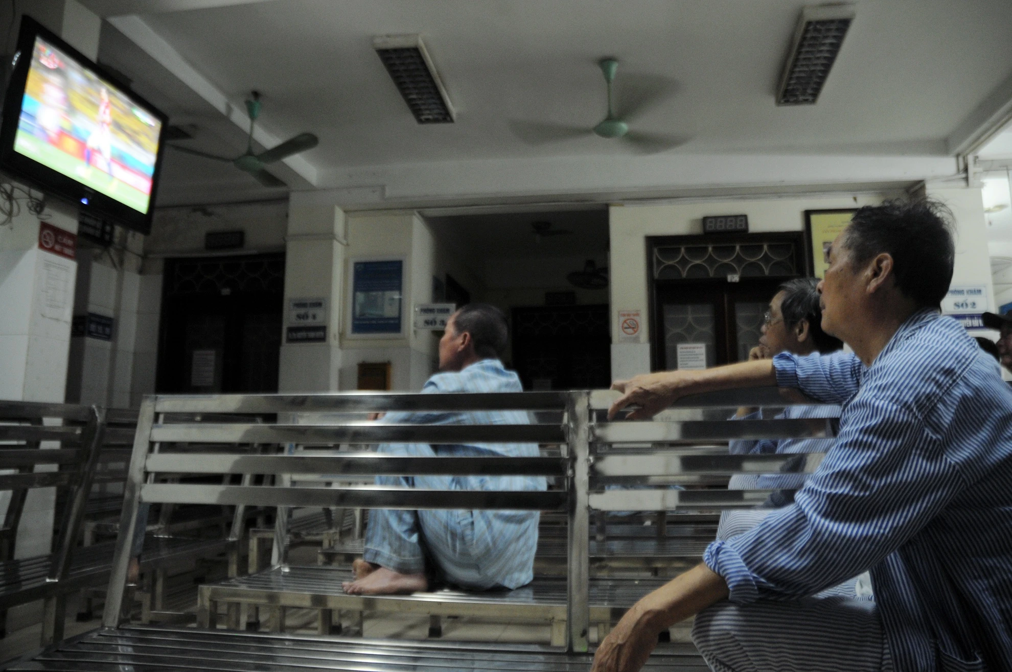 Tại bệnh viện da liễu Trung Ương, bệnh viện Bạch Mai các bệnh nhân đang điều trị xuống dưới sảnh xem World Cup qua chiếc ti vi cỡ nhỏ.