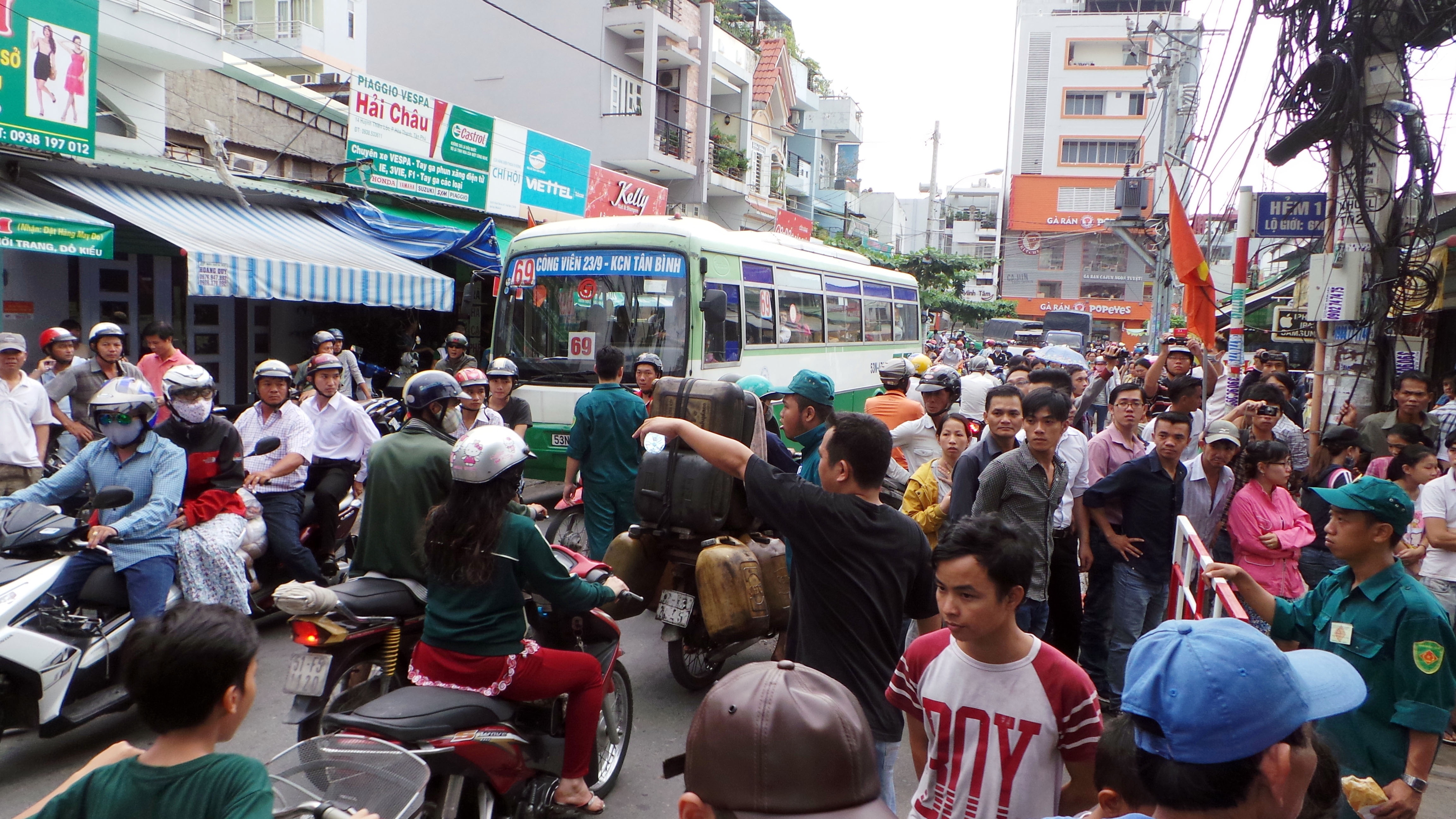 | Hàng trăm người hiếu kỳ tập trung theo dõi vụ việc khiến giao thông ùn tắc, hỗn loạn. Ảnh: Trường Nguyên. |