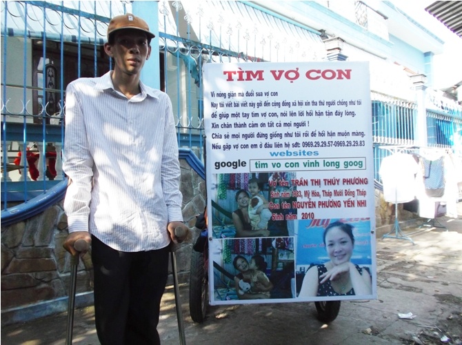 Ngày 1/7, tấm ảnh người đàn ông chạy xe ba gác, chở theo sau tấm bảng lớn với dòng chữ in đậm "Tìm vợ con", bên cạnh là hình người phụ nữ ôm đứa trẻ, số điện thoại liên hệ và những lời xin lỗi vợ, lan truyền khắp các trang mạng.