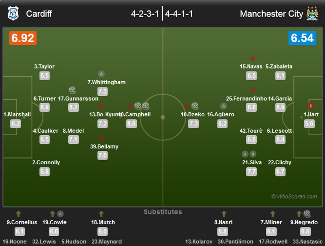 Man City hành quân đến sân của Cardiff với vị thế của đội bóng ở cửa trên. So sánh về lực lượng và kinh nghiệm thi đấu tại giải Ngoại hạng Anh, đoàn quân của HLV Pellegrini được đánh giá sẽ không gặp nhiều khó khăn để bỏ túi 3 điểm. Tuy nhiên, Man City lại không thể chứng tỏ sức mạnh trước tân binh của Premier League.