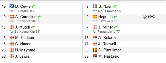 Tuy nhiên, đội khách không giữ được thành quả khi để đối phương gỡ hòa 1-1 sau đó 6 phút, và tác giả của bàn thắng là Gunnarsson. Không chấp nhận trận hòa trước tân binh Ngoại hạng Anh, HLV Pellegrini quyết định có sự điều chỉnh đội hình thi đấu bằng việc đưa Negredo và Samir Nasri vào sân. Đáng tiếc là Man City không tạo nên sự khác biệt so với những phút trước đó.