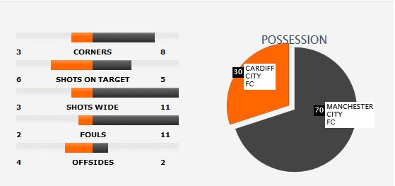 Dù chiếm thế chủ động trên sân và tung ra khá nhiều cú dứt điểm, nhưng Man xanh không thể chuyển hóa thành bàn thắng. Trước hàng thủ chơi với số đông của Cardiff, Man City chủ yếu sử dụng đến những cú sút từ ngoài vòng 16m50. Pha tấn công đáng chú ý nhất của đội khách là cú đánh đầu của Dzeko (31’).