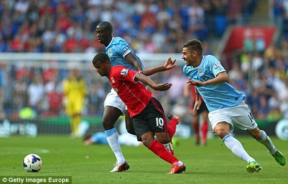 Trái lại, thủ môn Joe Hart của Man xanh phải hai lần vào lưới nhặt bóng trong vòng 6 phút (từ 79 đến 85). Campbell, một cầu thủ cũ của MU, đã ghi cả hai bàn thắng cho Cardiff. Ở phút cuối trận, tân binh Negredo ghi bàn rút ngắn tỷ số xuống 2-3 cho Man City. Kết quả trận đấu giữa Man xanh và Cardiff là bất ngờ lớn nhất ở vòng 2 Ngoại hạng Anh.