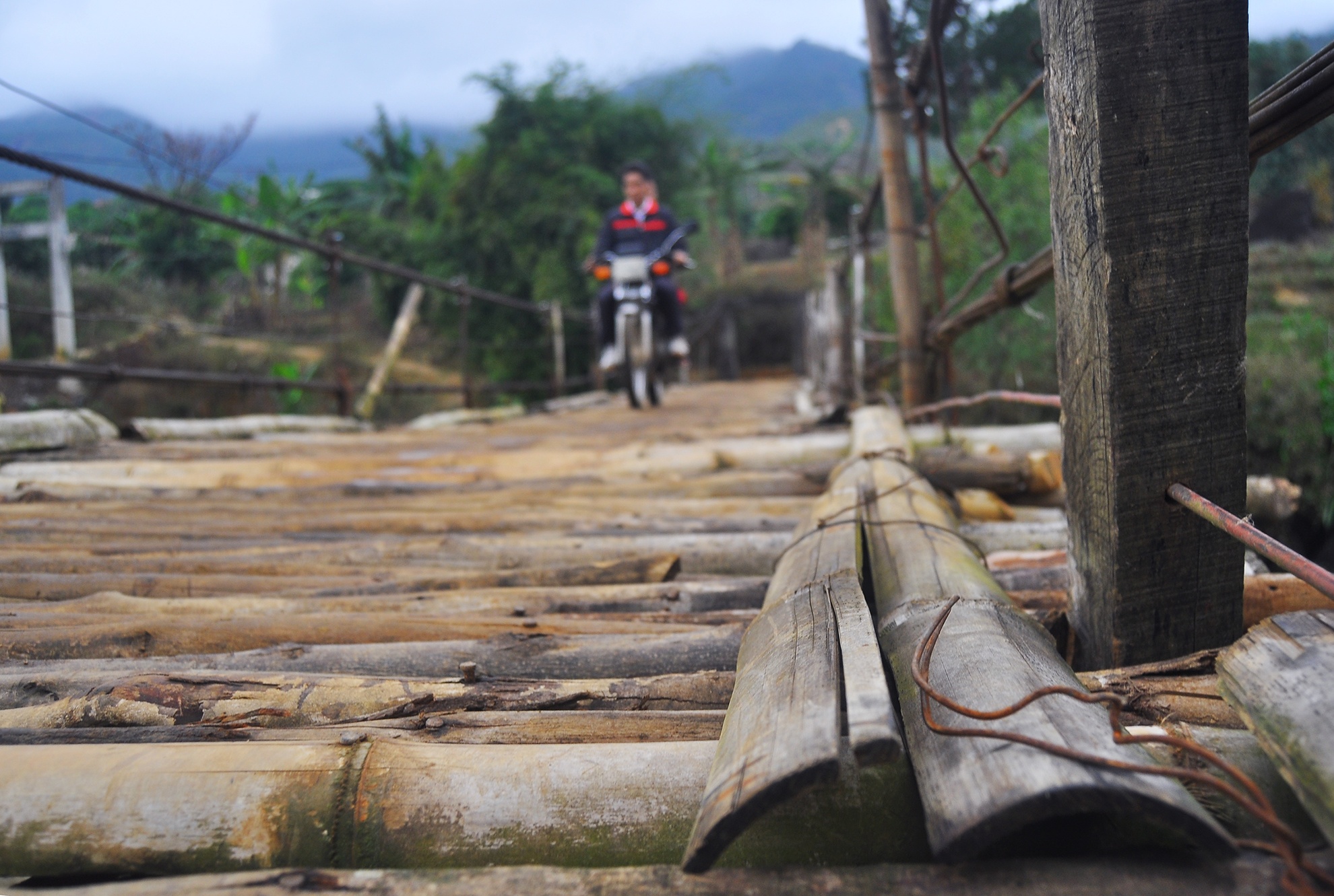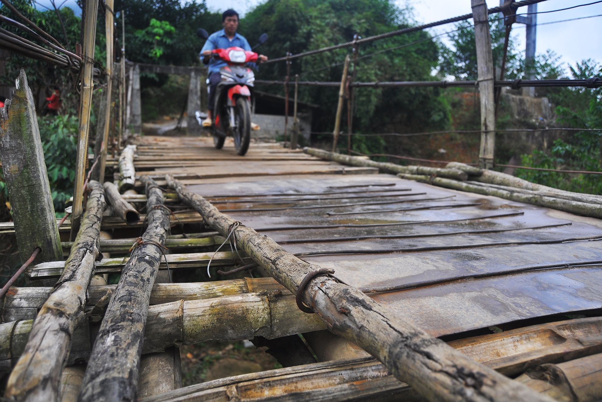 | Anh Vàng A Lứa (25 tuổi), người dân bản Chu Va 6 cho hay, hàng ngày có hàng trăm lượt người dân hai bản đi qua cầu. Mặt cầu được ghép bằng thân gỗ bạch đàn nhỏ tròn nhưng nẹp không chắc chắn. Khi di chuyển xe máy qua nhiều vị trí thân gỗ xoay tròn rất trơn, đặc biệt khi trời mưa. |