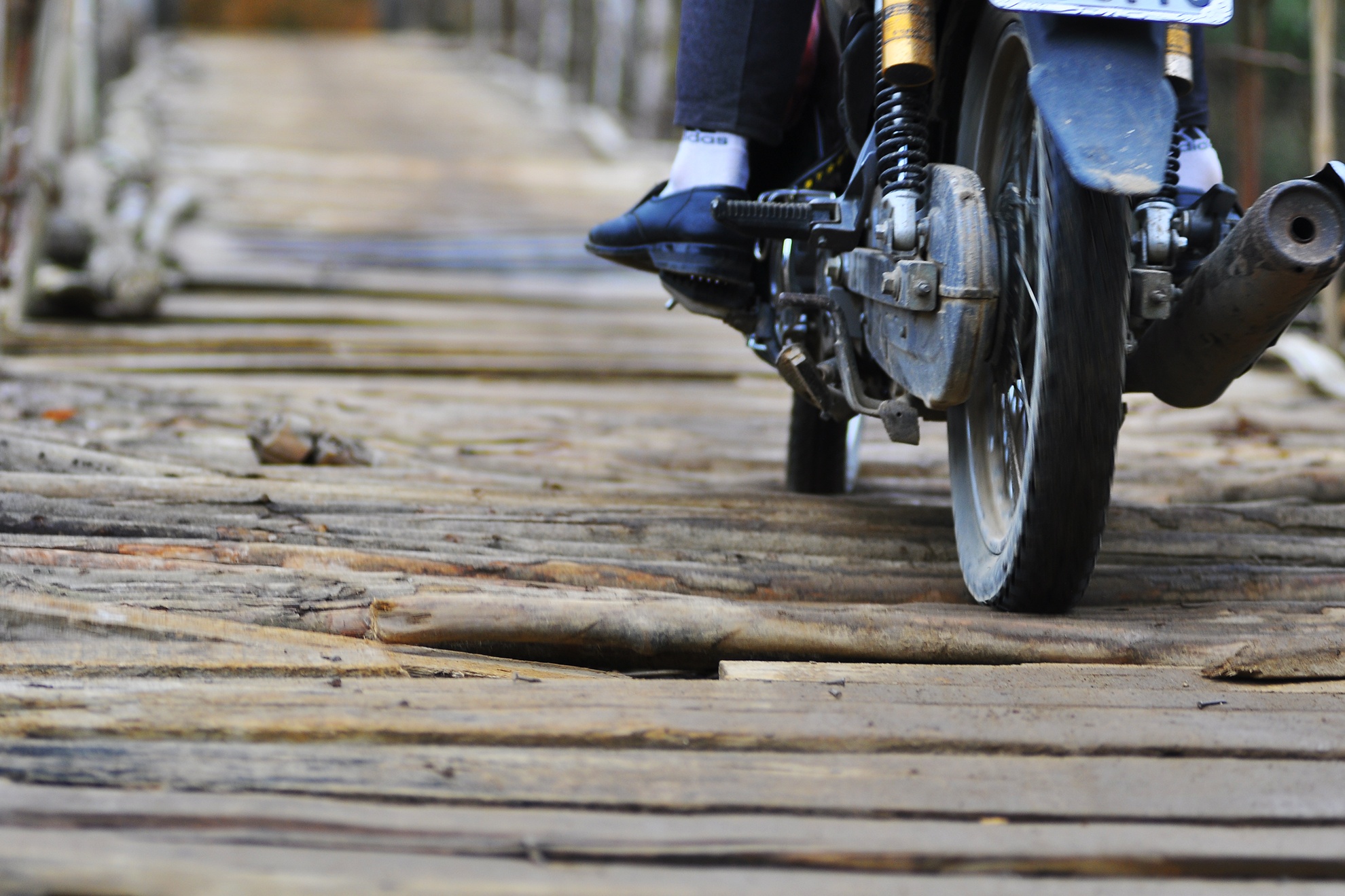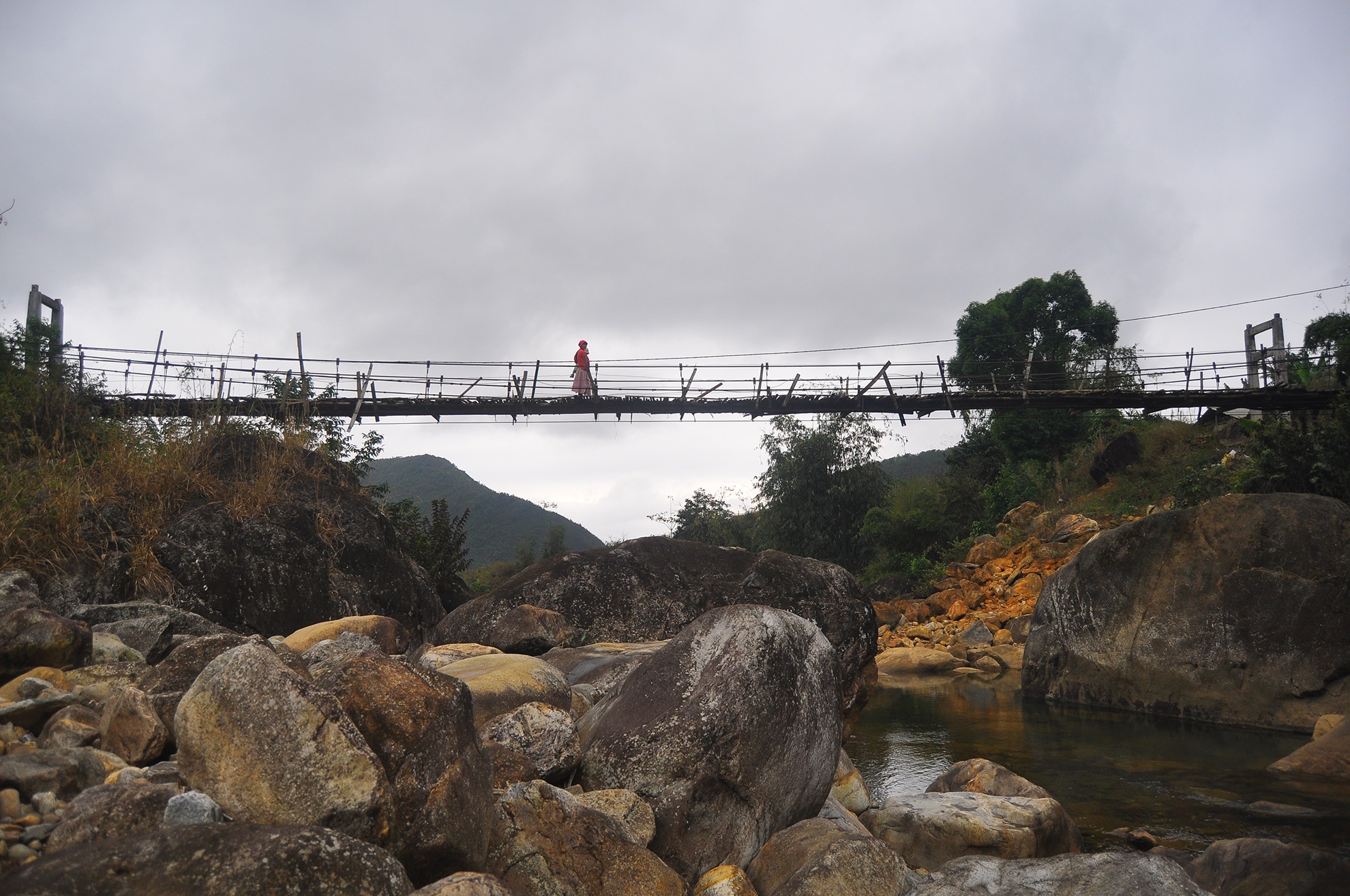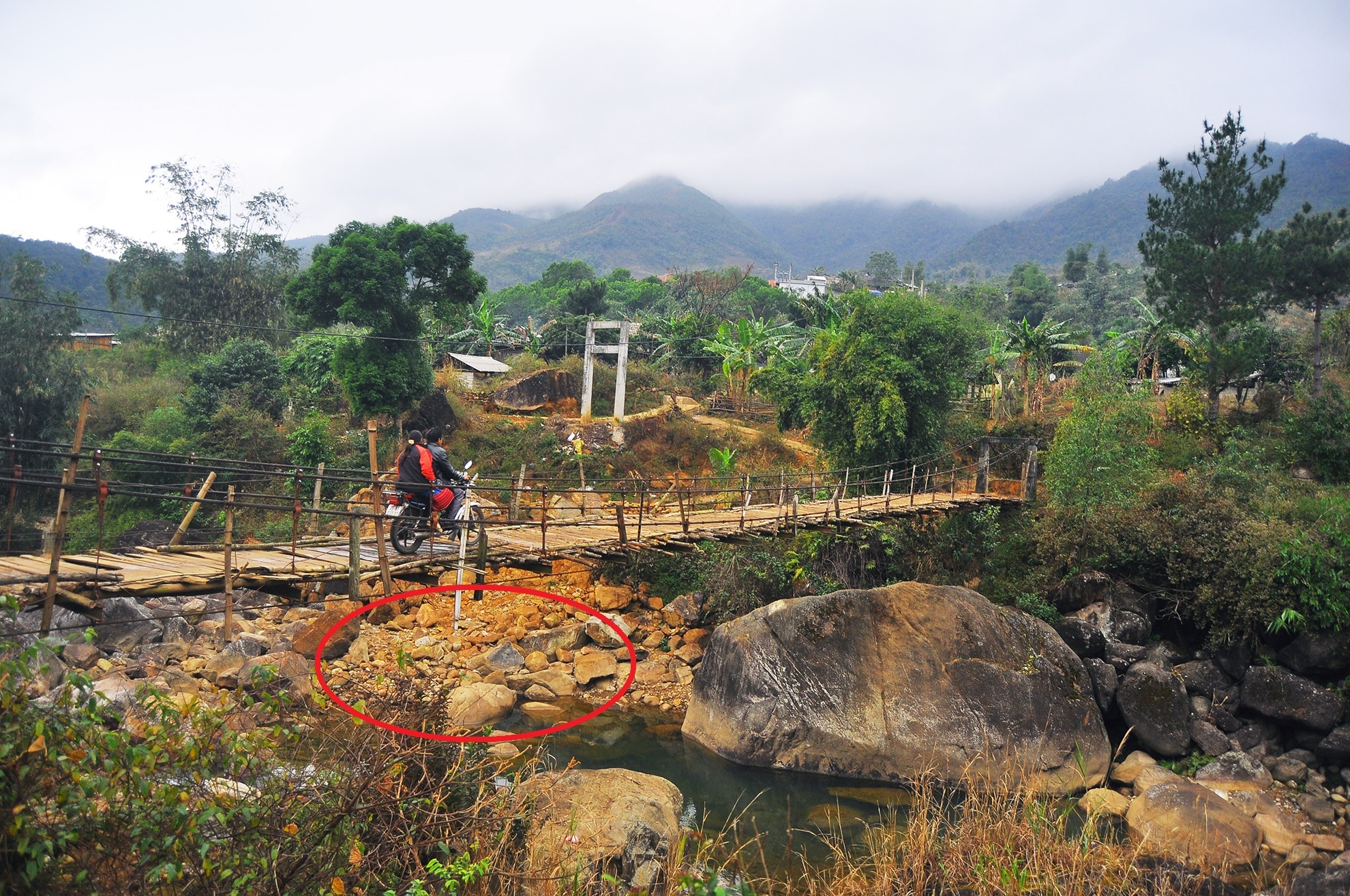 | Dù lòng cầu rộng 1,5 m nhưng không thể di chuyển hai làn xe máy cùng một lúc do khi tránh nhau rất dễ mất thăng bằng và ngã xuống suối. Ngoài xe máy, các loại xe thồ chở nông sản và súc vật không thể di chuyển qua đây.