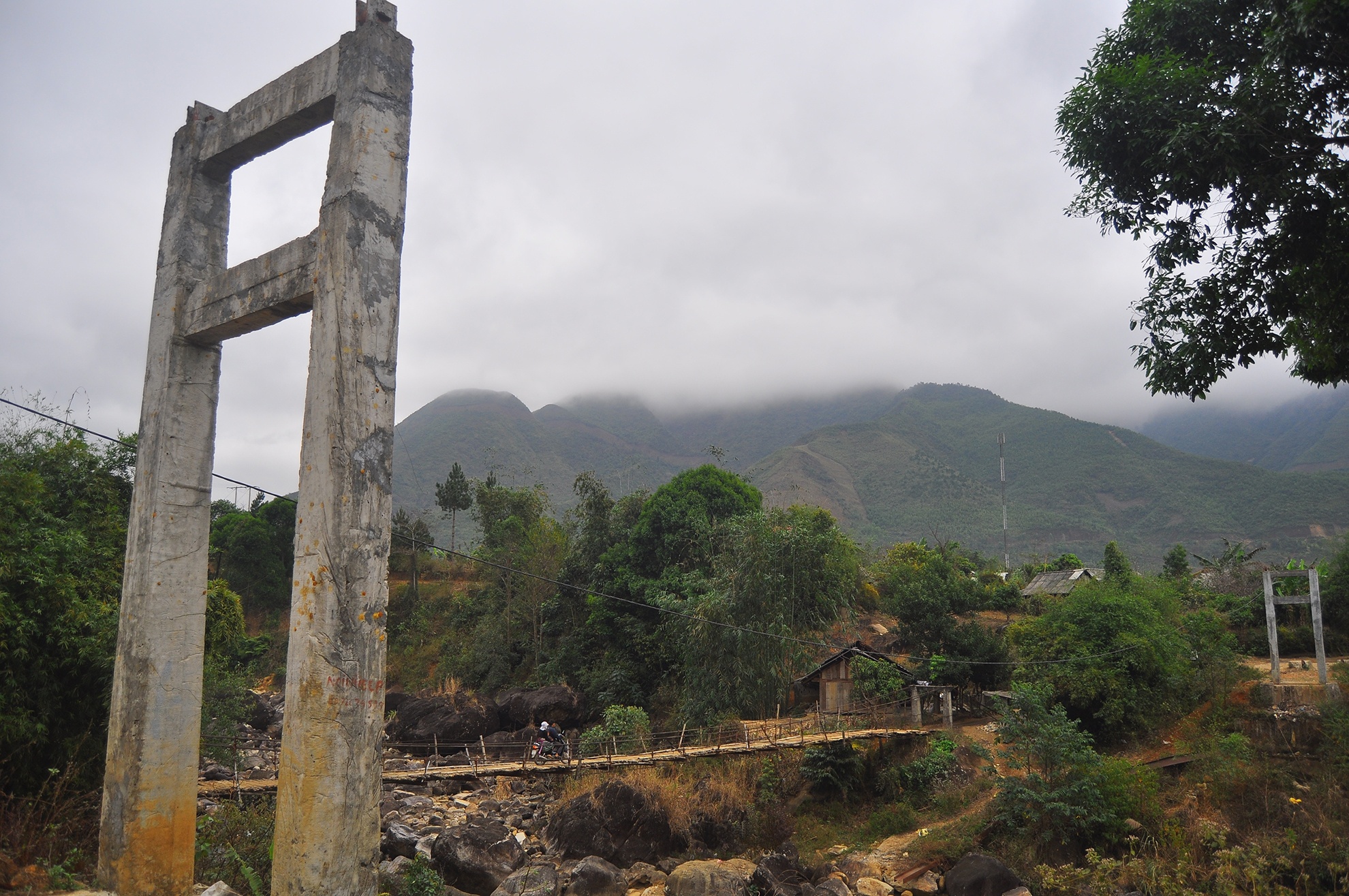 | Sở GTVT Lai Châu và UBND huyện Tam Đường sử dụng hệ thống cầu treo cũ gần đó và vận động người dân hai bản tự chặt cây, xẻ ván để làm nền cầu. Hầu hết những cây gỗ, tre nứa sau một thời gian sử dụng đã khô mục. |