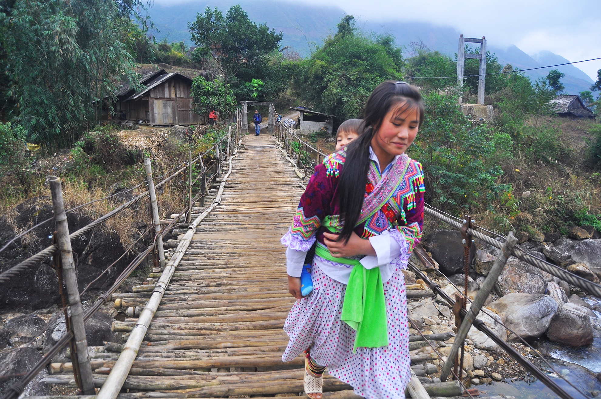 | Anh Lứa cũng cho biết điều hàng ngày trẻ em trong bản vẫn phải tự tới trường qua cây cầu này. Trẻ nhỏ dưới 5 tuổi đều được phụ huynh địu qua suối. Người dân trong bản lo lắng về tình trạng mặt cầu xuống cấp, gỗ khô mục khi chỉ còn vài tháng nữa sẽ tới mùa mưa. |
