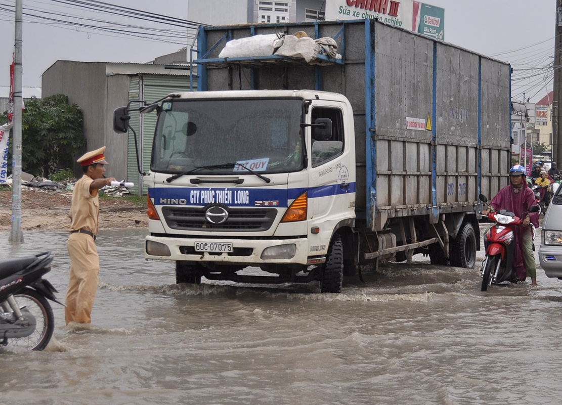 | Quốc lộ 51 qua TP Biên Hòa bị ngập sâu nên lực lượng chức năng phải lập chốt chặn, điều chuyển hướng lưu thông cho các phương tiện để tránh ngập, đảm bảo an toàn. |