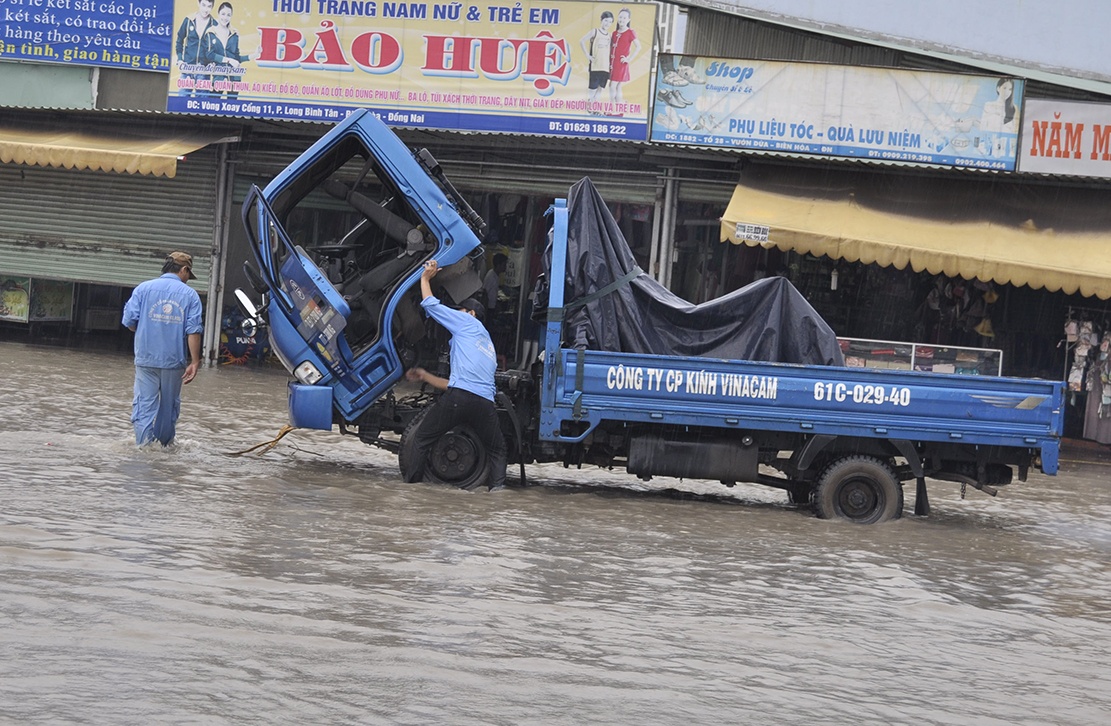 | Một chiếc xe tải chết máy khi qua điểm ngập trên đường Võ Nguyên Giáp (TP Biên Hòa). |