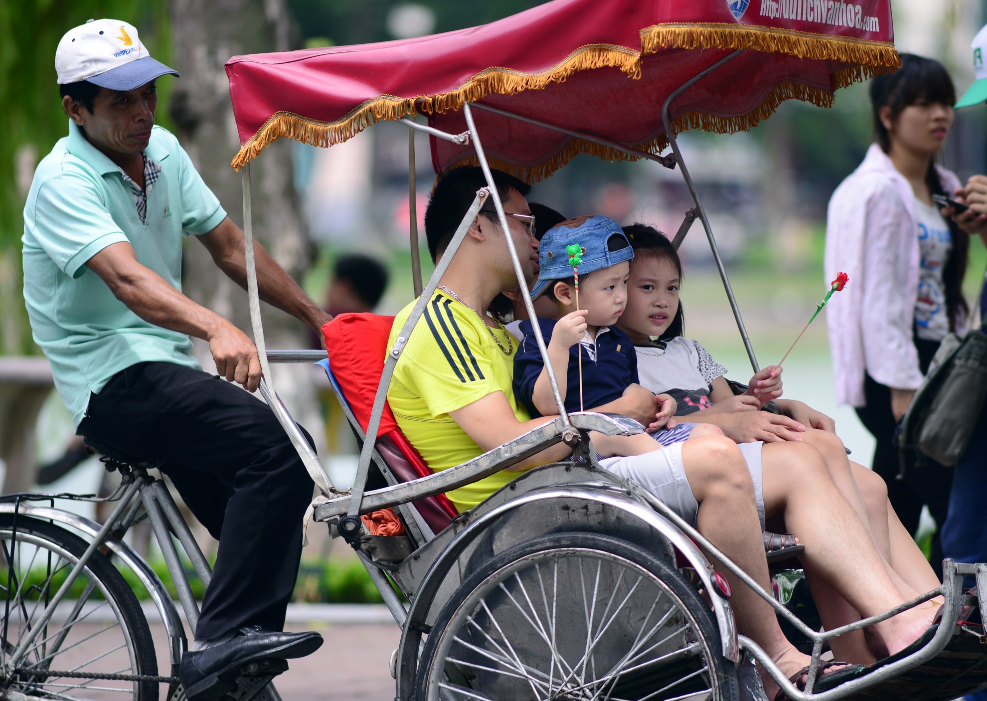 Sáng cuối tuần, nhiều gia đình đã chọn phương tiện xích lô để dạo phố hóng mát.