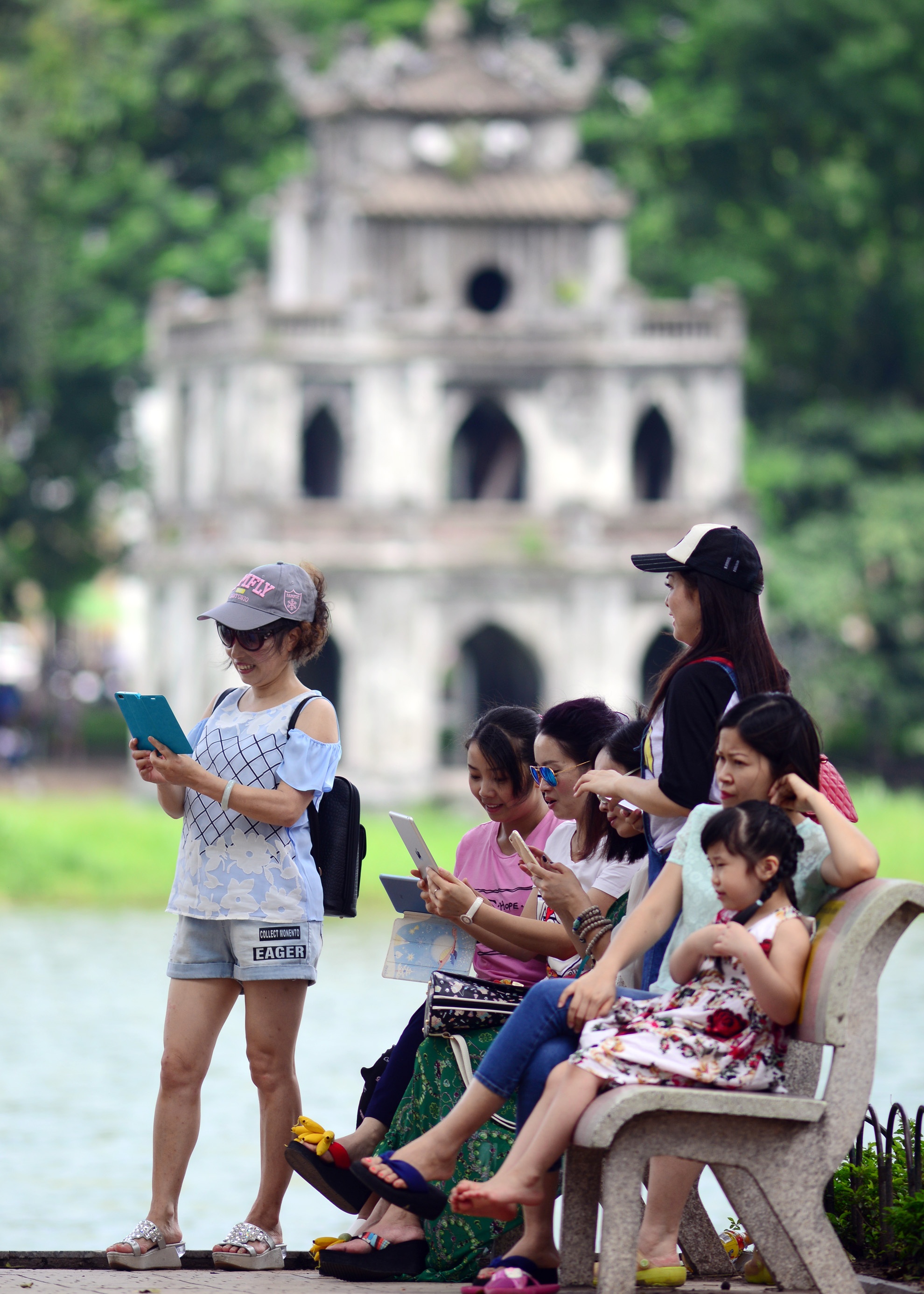 | Bên ghế đá hồ Hoàn Kiếm, nhiều khách du lịch cùng tận hưởng không khí mát mẻ. |
