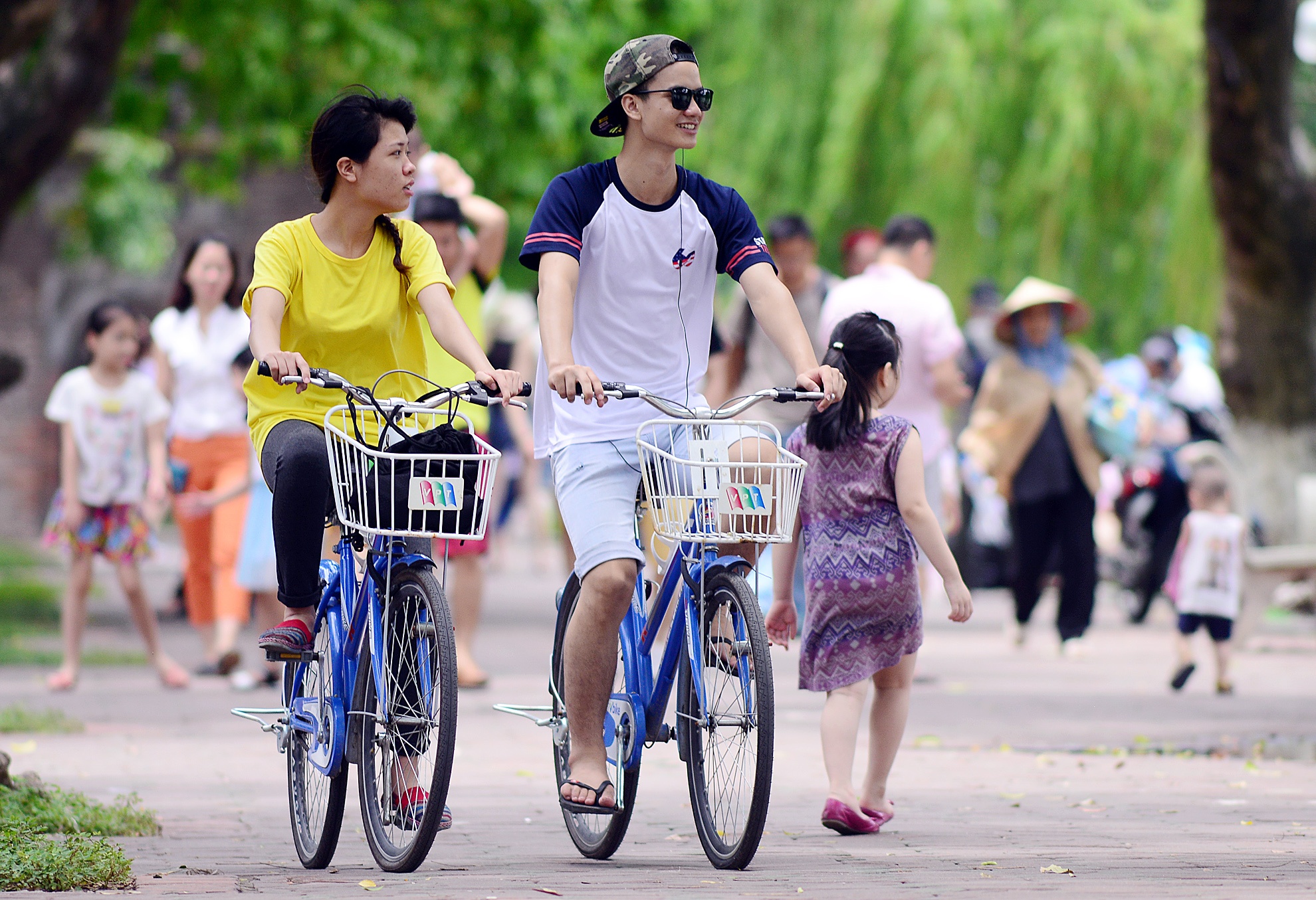 Đôi bạn trẻ sánh đôi thư thái đạp xe tận hưởng bầu không khí mới.