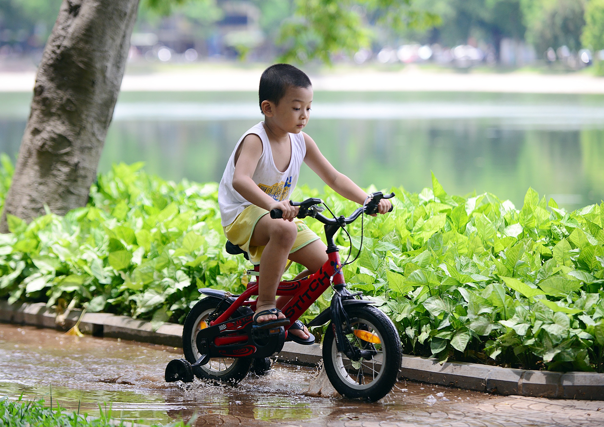 | Một bé trai đạp xe qua vũng nước còn đọng lại do cơn mưa đêm qua trong công viên Thống Nhất. |