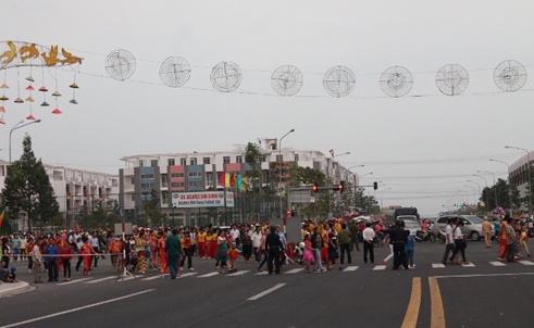 | Đoàn lân sư rồng vào trung tâm hành chính mới biểu diễn. |