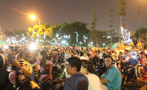 | Hàng ngàn người dân đổ về trung tâm hành chính theo dõi lễ hội vào tối 20/2. |