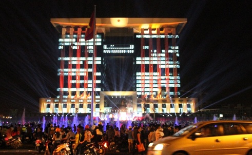 | Toàn tòa nhà trung tâm hành chính lung linh trong ánh đèn chiếu. |