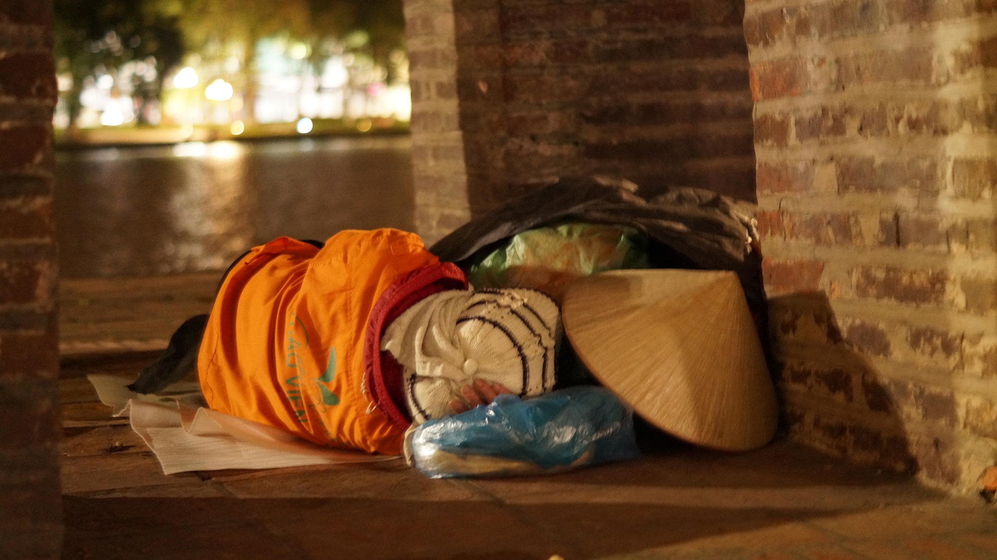 Những công nhân ngủ dưới chân tháp Hòa Phong để canh hoa trong đêm rét 6 độ C. Ảnh: Quỳnh Như. |