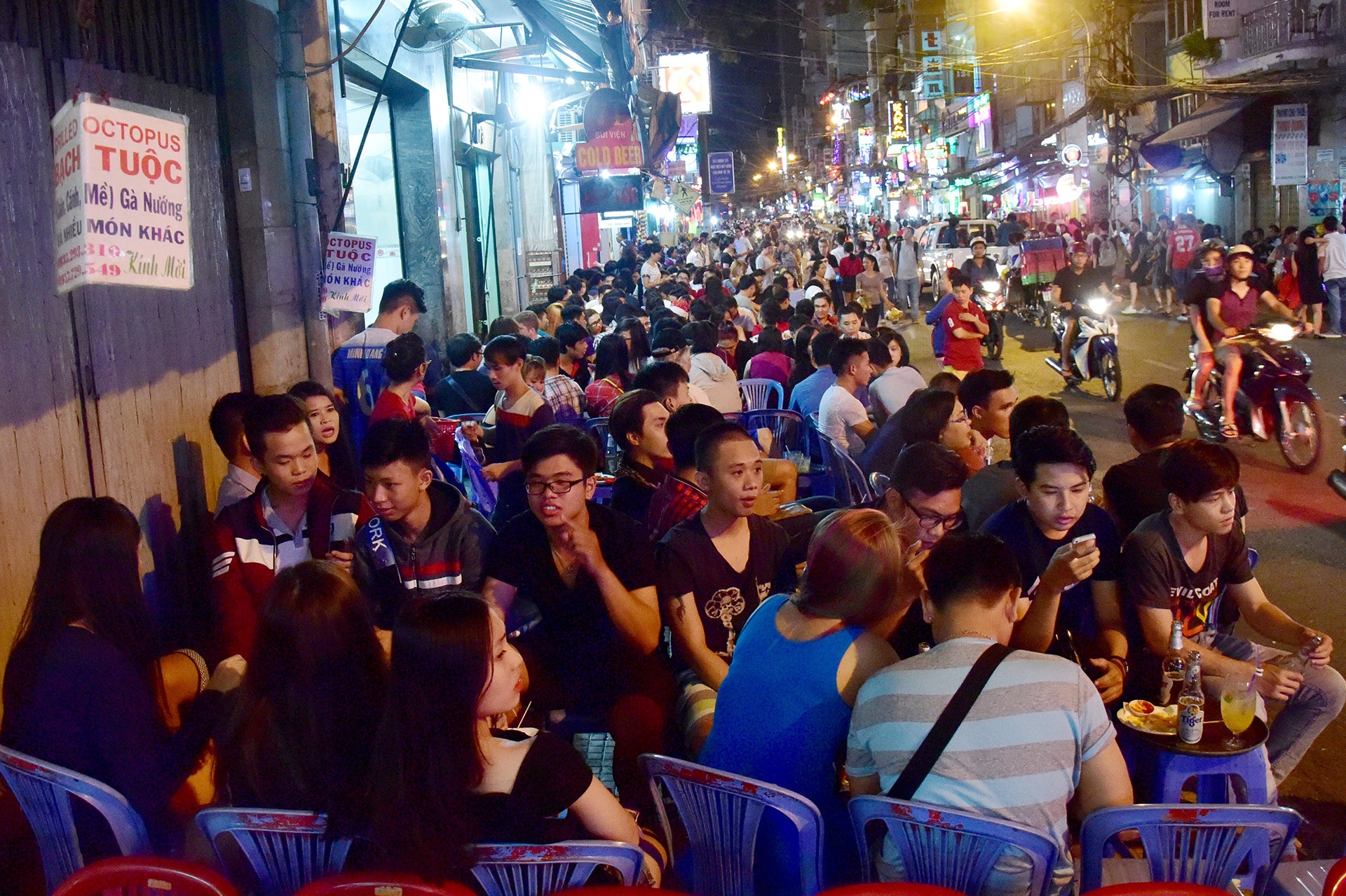 Tại các tuyến phố Tây nổi tiếng Sài Gòn như Bùi Viện, Phạm Ngũ Lão giới trẻ tập trung ăn uống vỉa hè đông đúc. Năm nay, nơi đây khá vắng bóng người nước ngoài. Ảnh: Lê Quân.