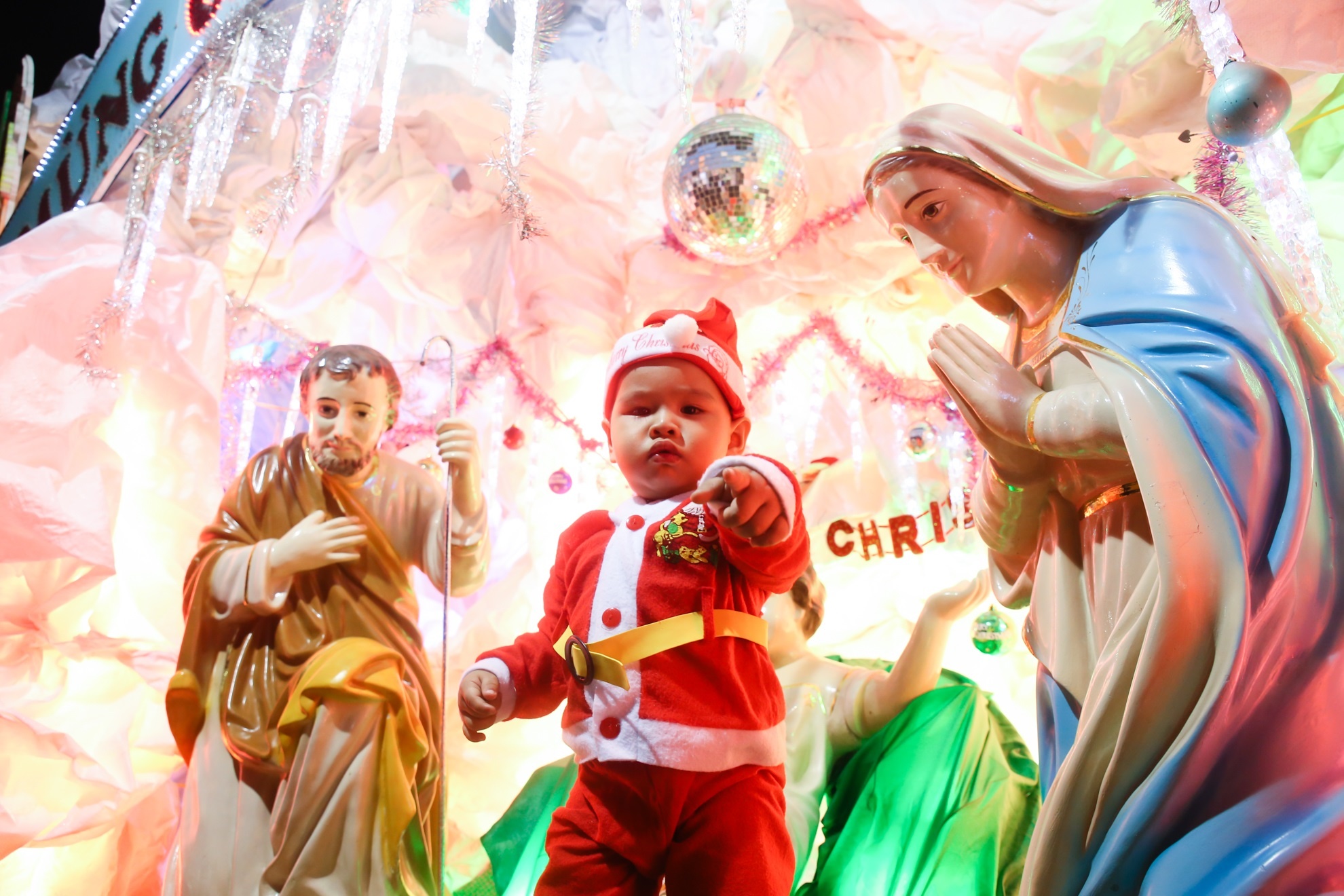 Thời khắc 0h ngày 25/12, chúa Giêsu ra đời, nhiều em bé vẫn tươi tỉnh dù được người lớn cho đi chơi khuya. Ảnh: Anh Tuấn.