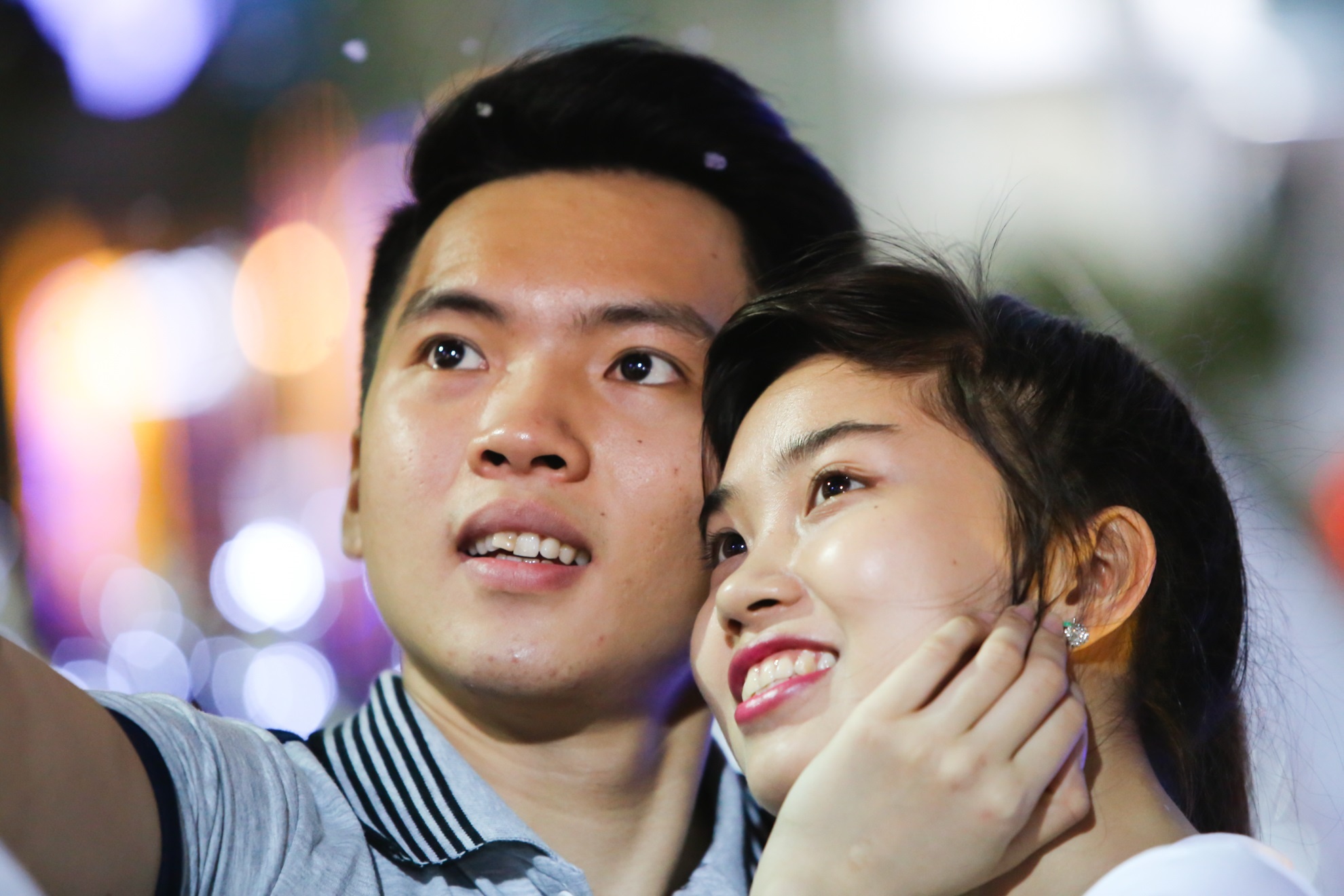 Đôi bạn trẻ Huỳnh Tuấn Phước và Phạm Ngọc Thuỳ Vân yêu nhau đã hai năm. Đây là lần đầu tiên hai người đi đón Noel trên phố đi bộ Sài Gòn. Ảnh: Hải An.