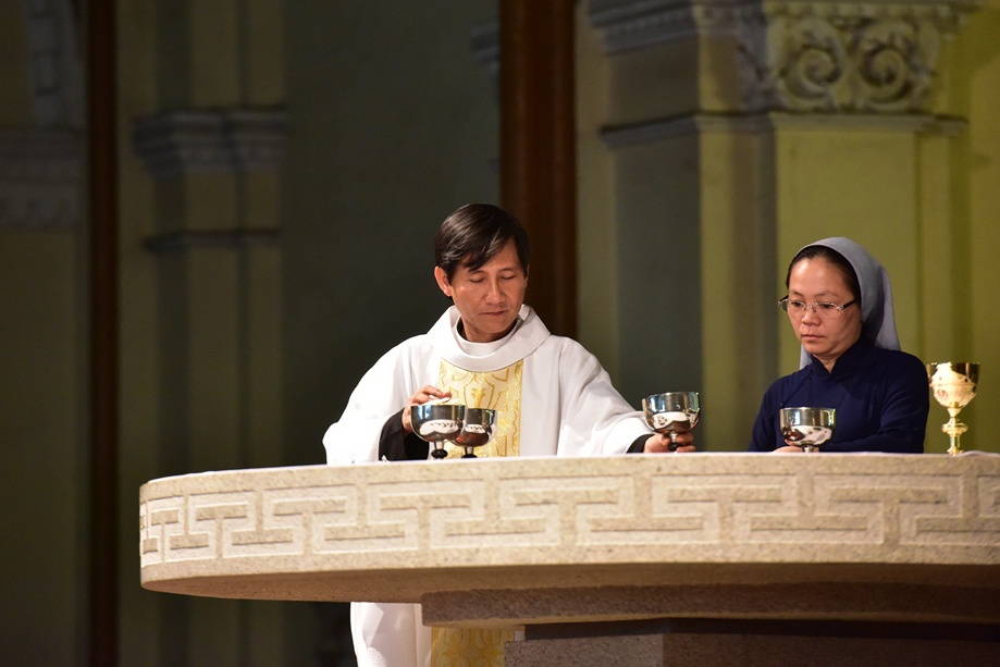 Linh mục chuẩn bị làm lễ mừng Chúa ra đời tại Nhà thờ Đức Bà, TP HCM. Ảnh: Lê Quân.
