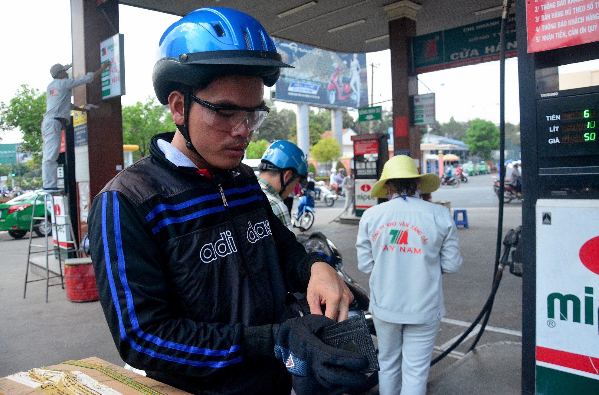 | Anh Đinh Ngọc Tú (ngụ quận 12), cũng một trong những người đầu tiên đổ giá xăng mới. "Công việc giao nhận hàng cho khách, việc giá xăng giảm mạnh như thế này đối với chúng tôi thật quá đỗi vui mừng, có thể tiết kiệm được một ít chi phí", anh nói. |