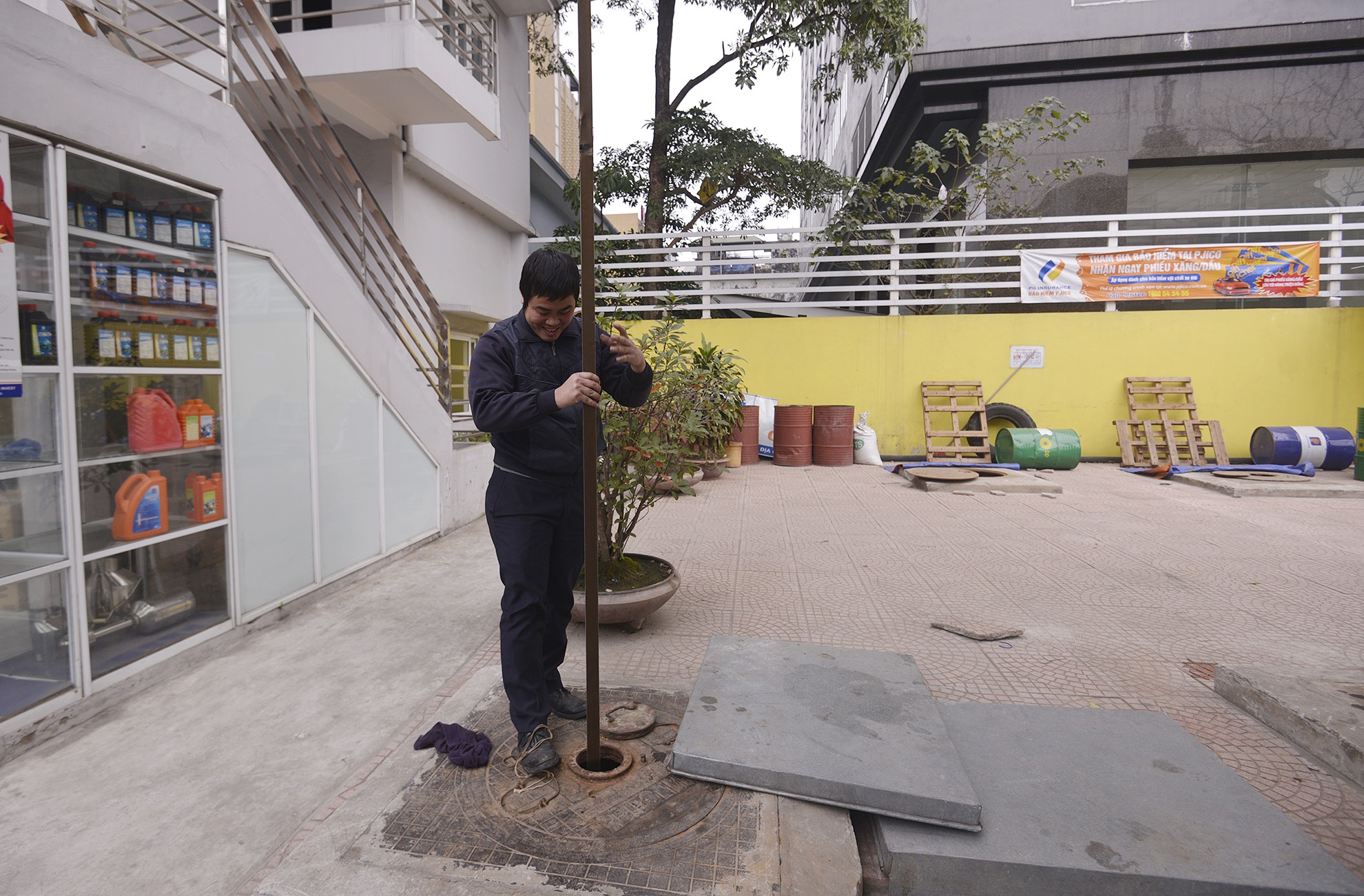 | Tại Hà Nội: Trước giờ giảm giá xăng, nhân viên tại trạm xăng trên đường Nguyễn Lương Bằng (quận Đống Đa) đo kiểm tra lượng xăng còn lại ở dưới kho. |
