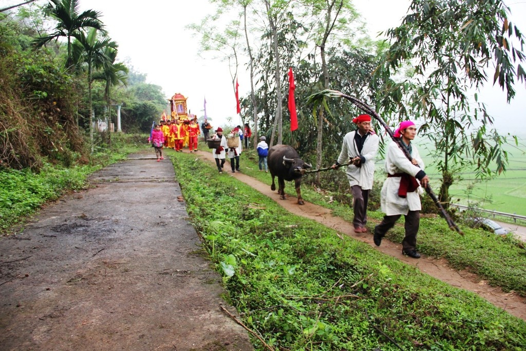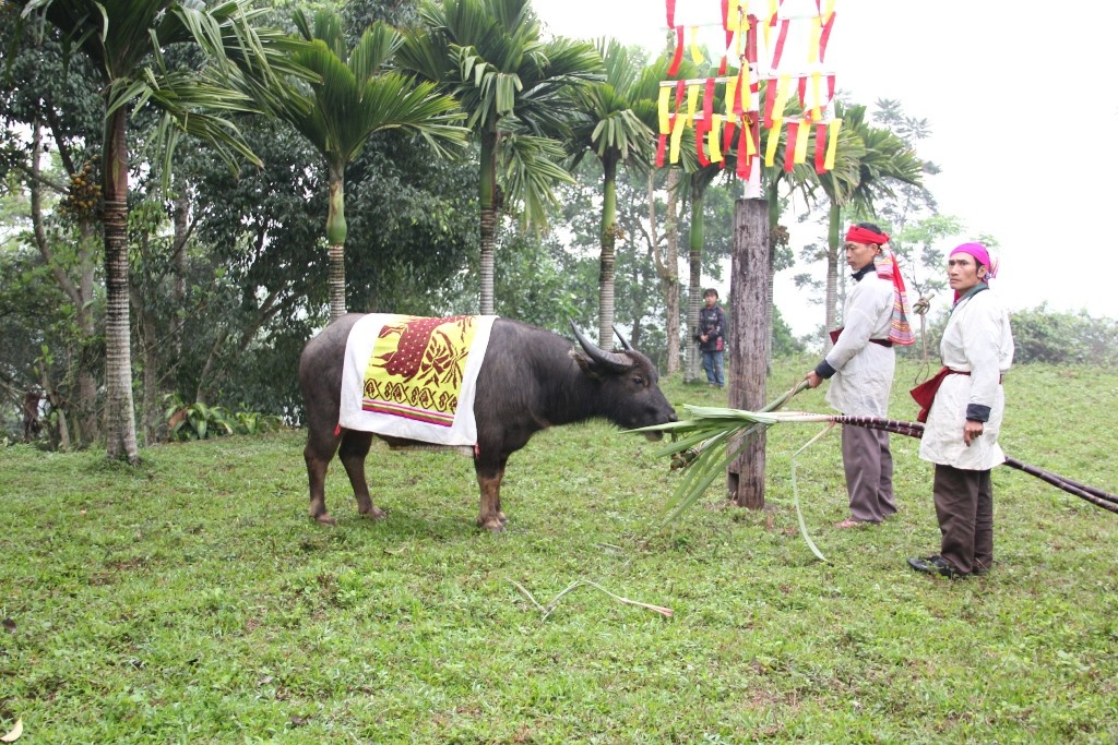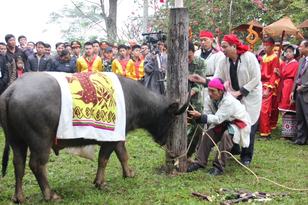 Trâu được đưa xuống tắm ở bến sông Tà Tạo (bến Quan) rồi đem lên làm lễ chém trong tiếng reo hò của bà con trong lễ hội đền Chín Gian, diễn ra hàng năm vào ngày 14-16/3.