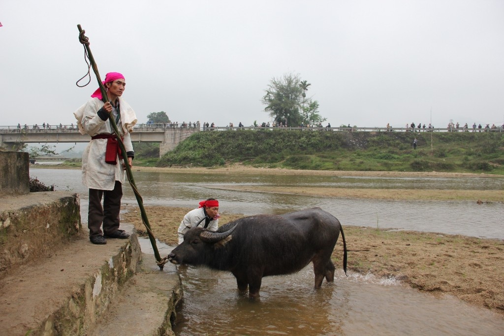 | Trước khi diễn ra lễ chém, trâu được đưa xuống tắm sạch sẽ ở bến sông Tà Tạo (bến Quan). |