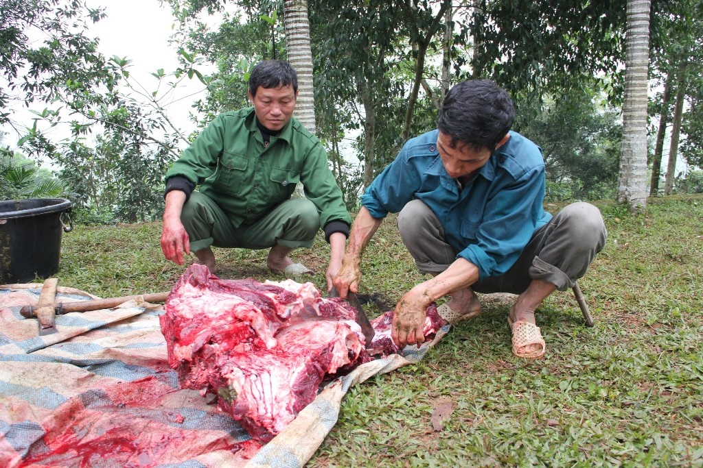 | Thịt trâu sau đó được xẻ ra dâng lên bề trên rồi đem ra cho bà con, du khách thưởng thức. |