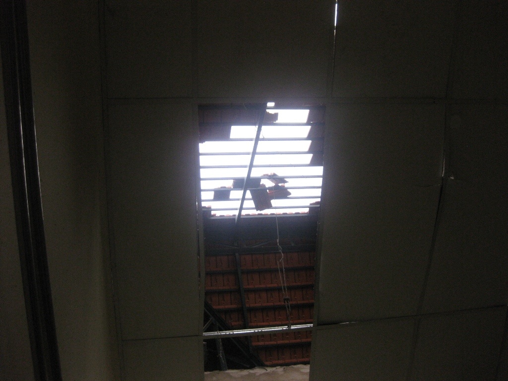 | Phần mái nhà thủng nhìn từ phía trong nhà... |