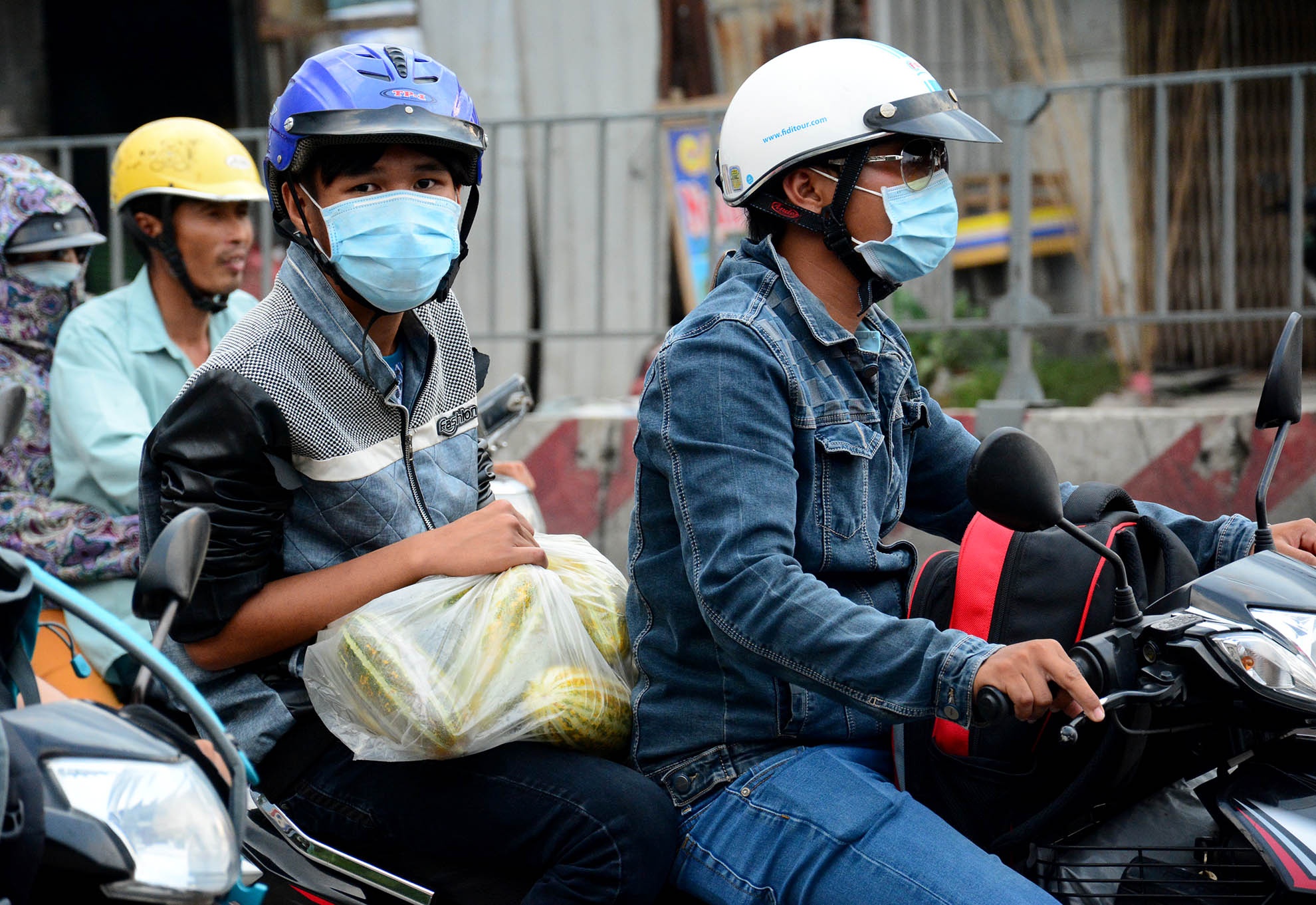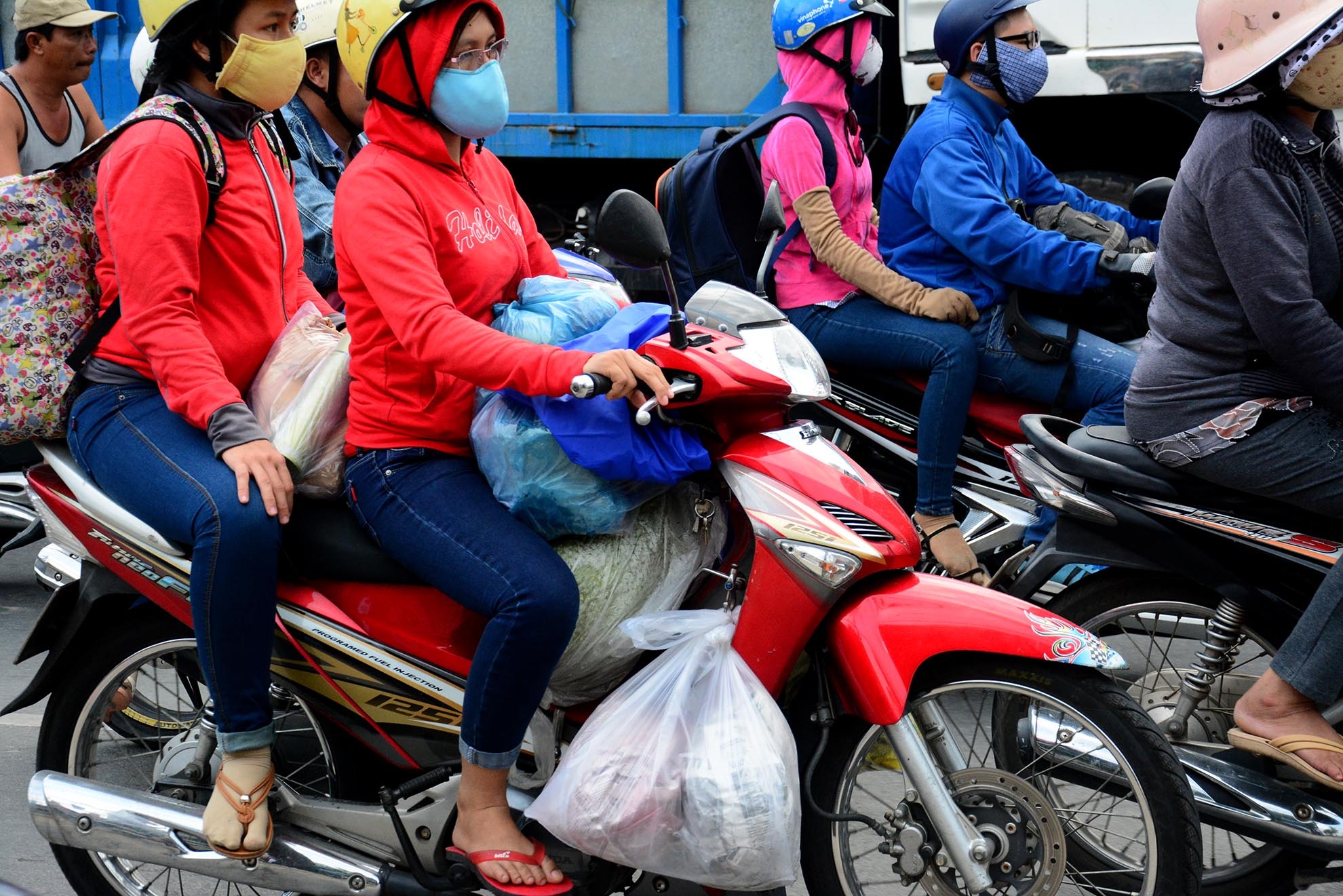 Do gặp mưa ở tỉnh Long An nên một số người khi vào thành phố vẫn chưa kịp cởi.