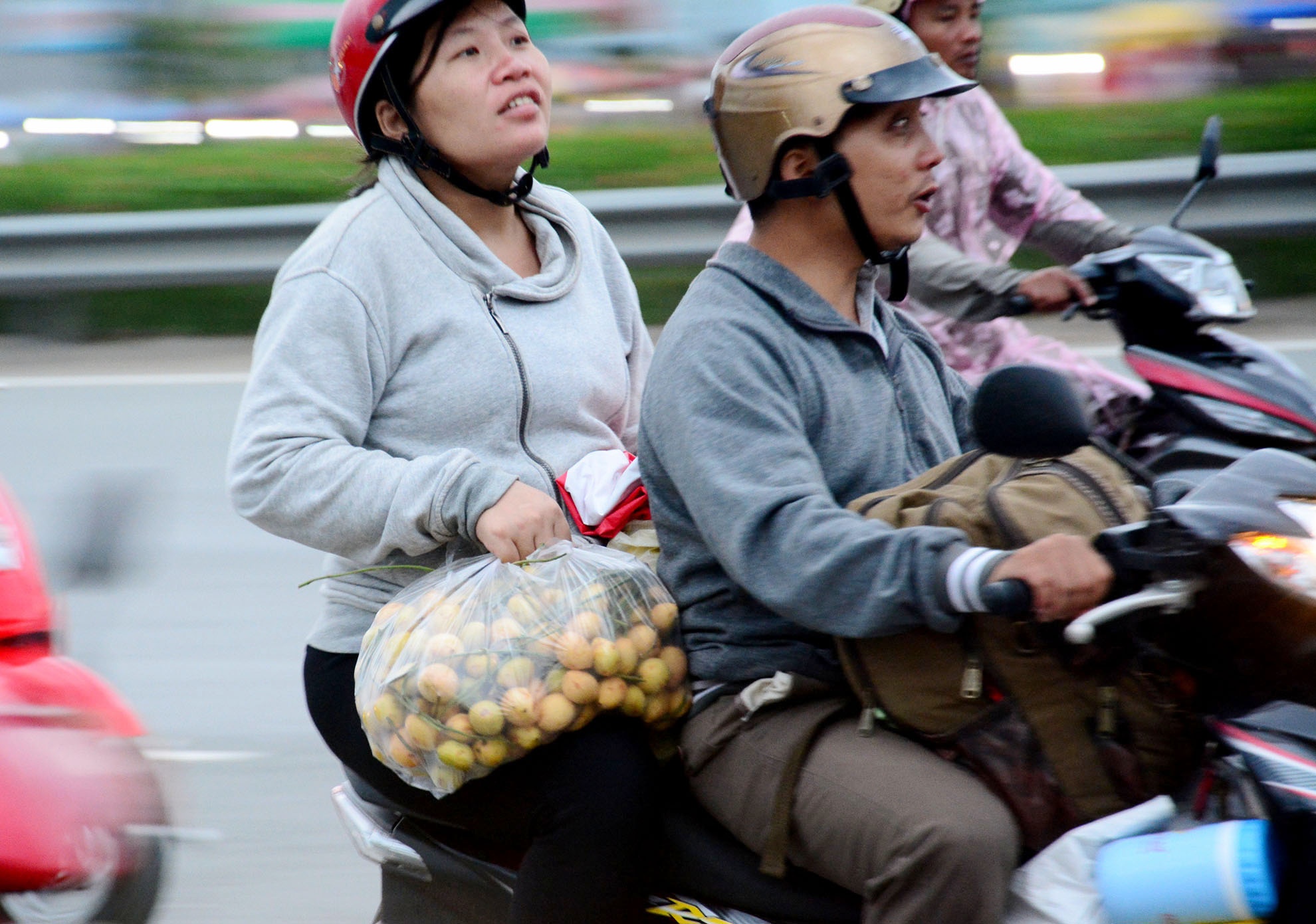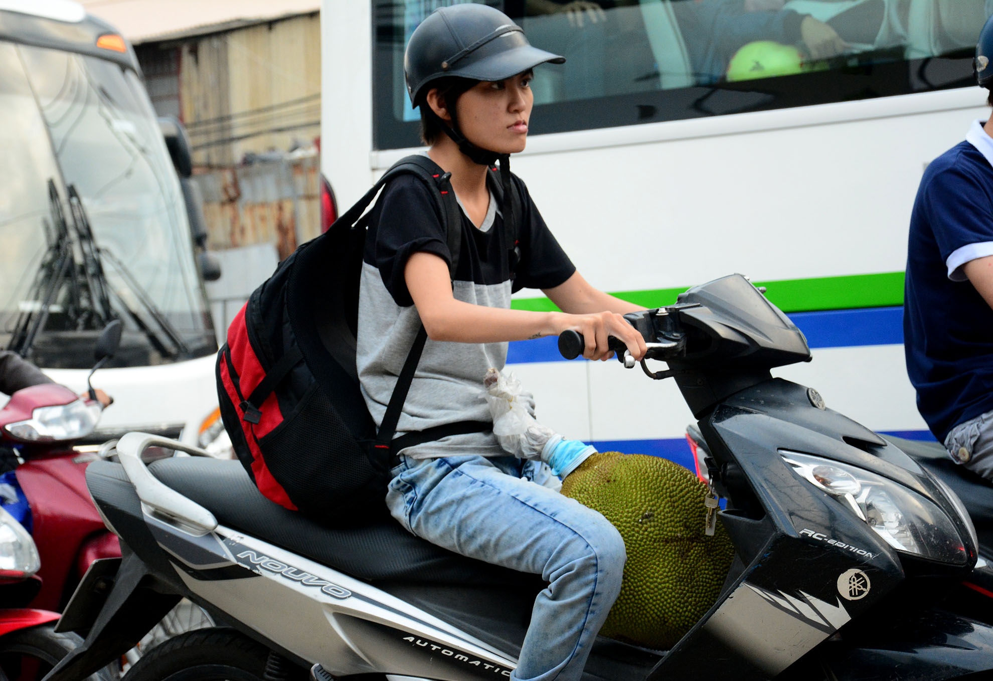 | Một cô gái kẹp thêm quả mít lưu thông qua cầu Bình Điền, quốc lộ 1A, huyện Bình Chánh. |