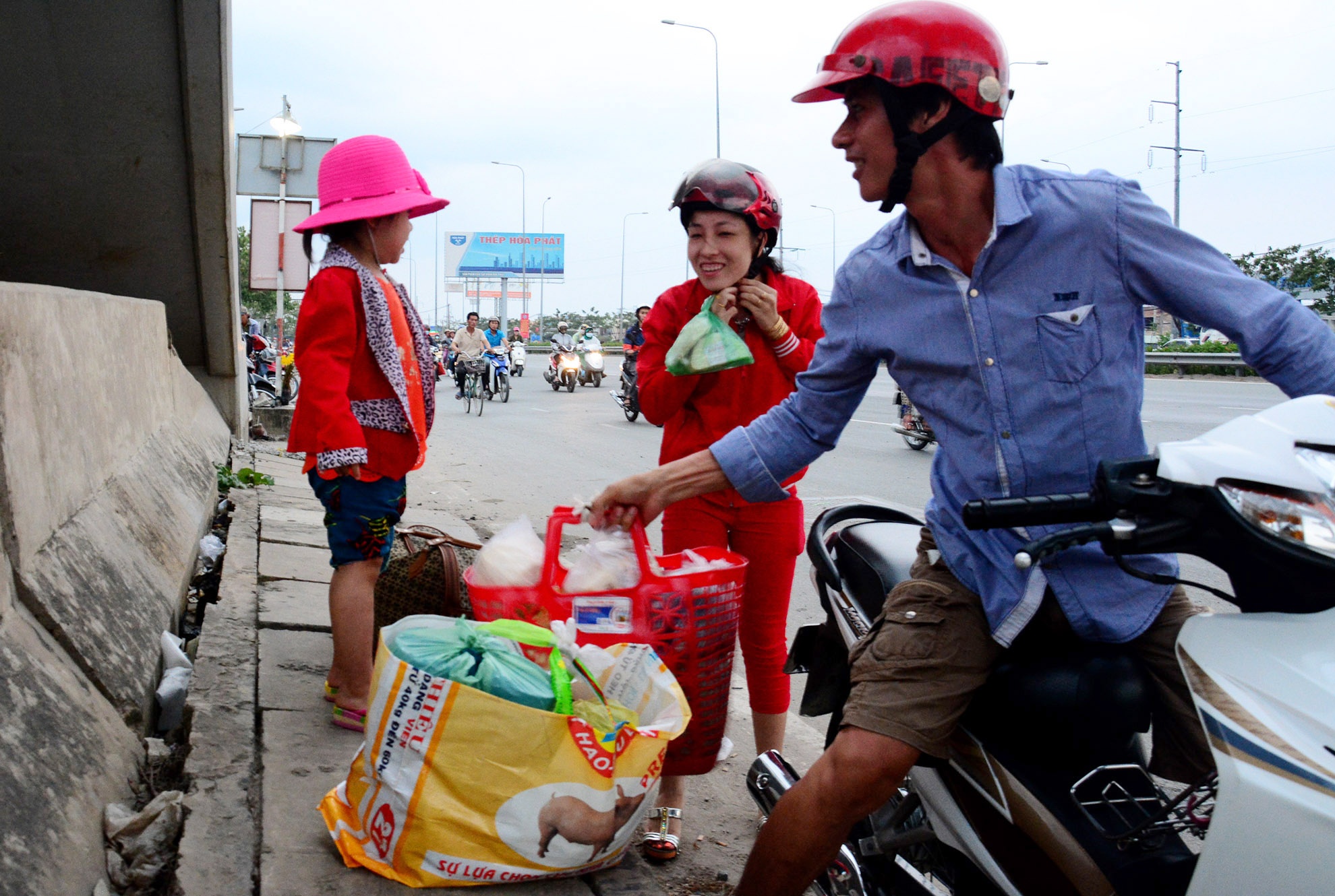 Chị Thu Diệp (quê Bến Tre) với lỉnh kỉnh đồ đạc, trong đó có một giỏ dừa đã gọt vỏ được chồng đón khi vừa xuống xe khách gần ngã 3 An Lạc, quận Bình Tân. Diệp cho biết, hai mẹ con chị về quê ngoại nghỉ lễ, thăm gia đình. Mỗi lần về quê, chị đều mang các loại kẹo dừa, dừa trái lên làm quà cho xóm trọ và để dùng.