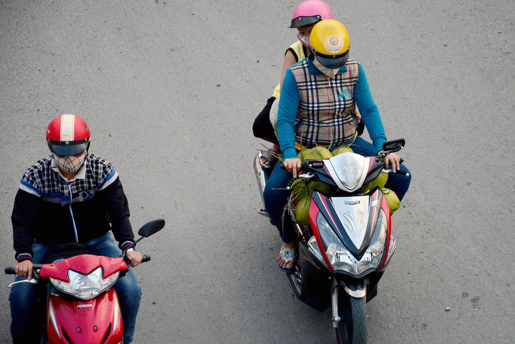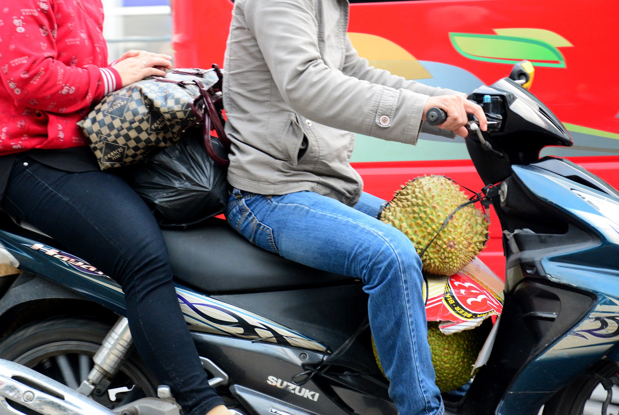 Còn 2 người đi trên chiếc xe tay ga mang theo cả chùm dừa.