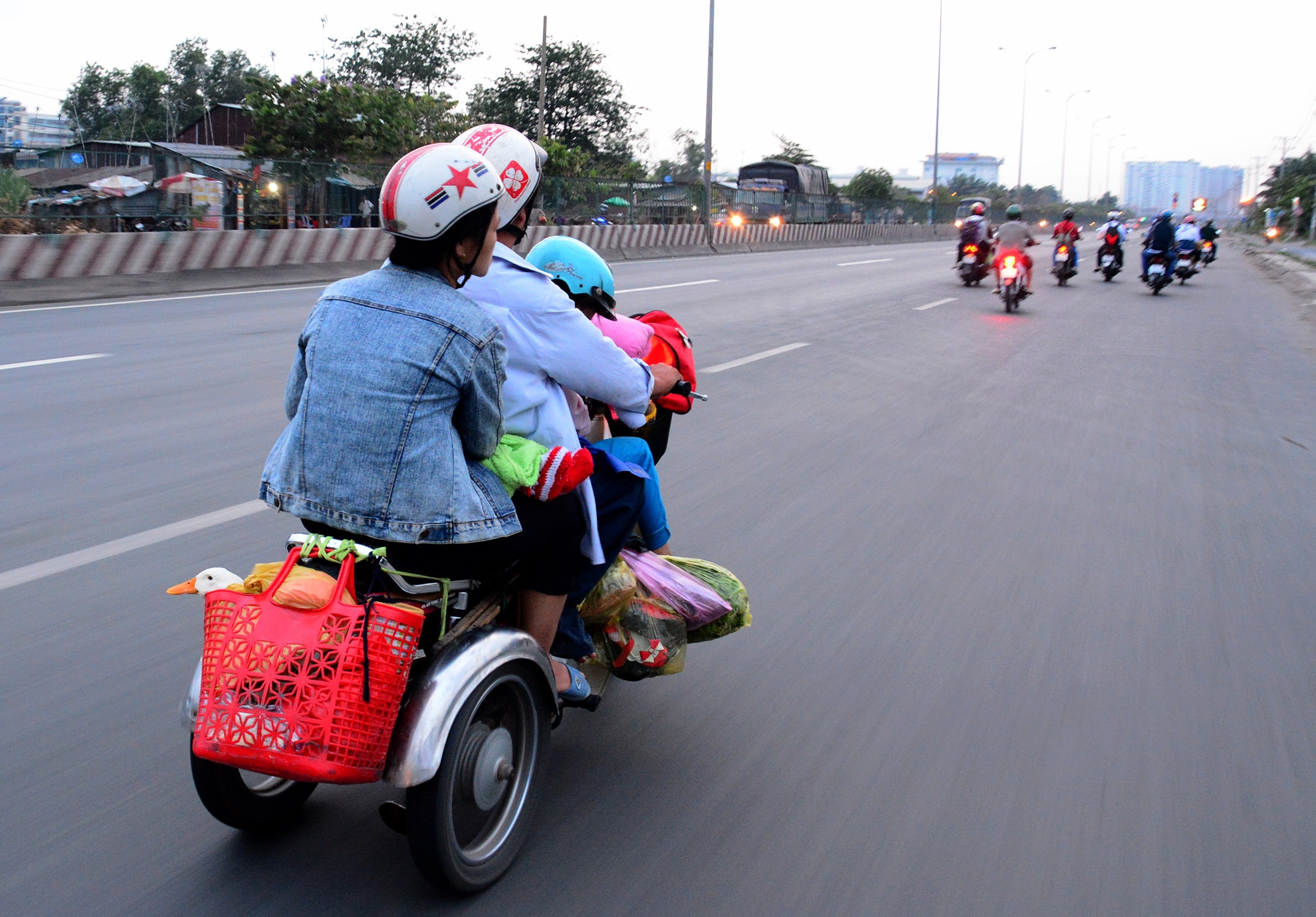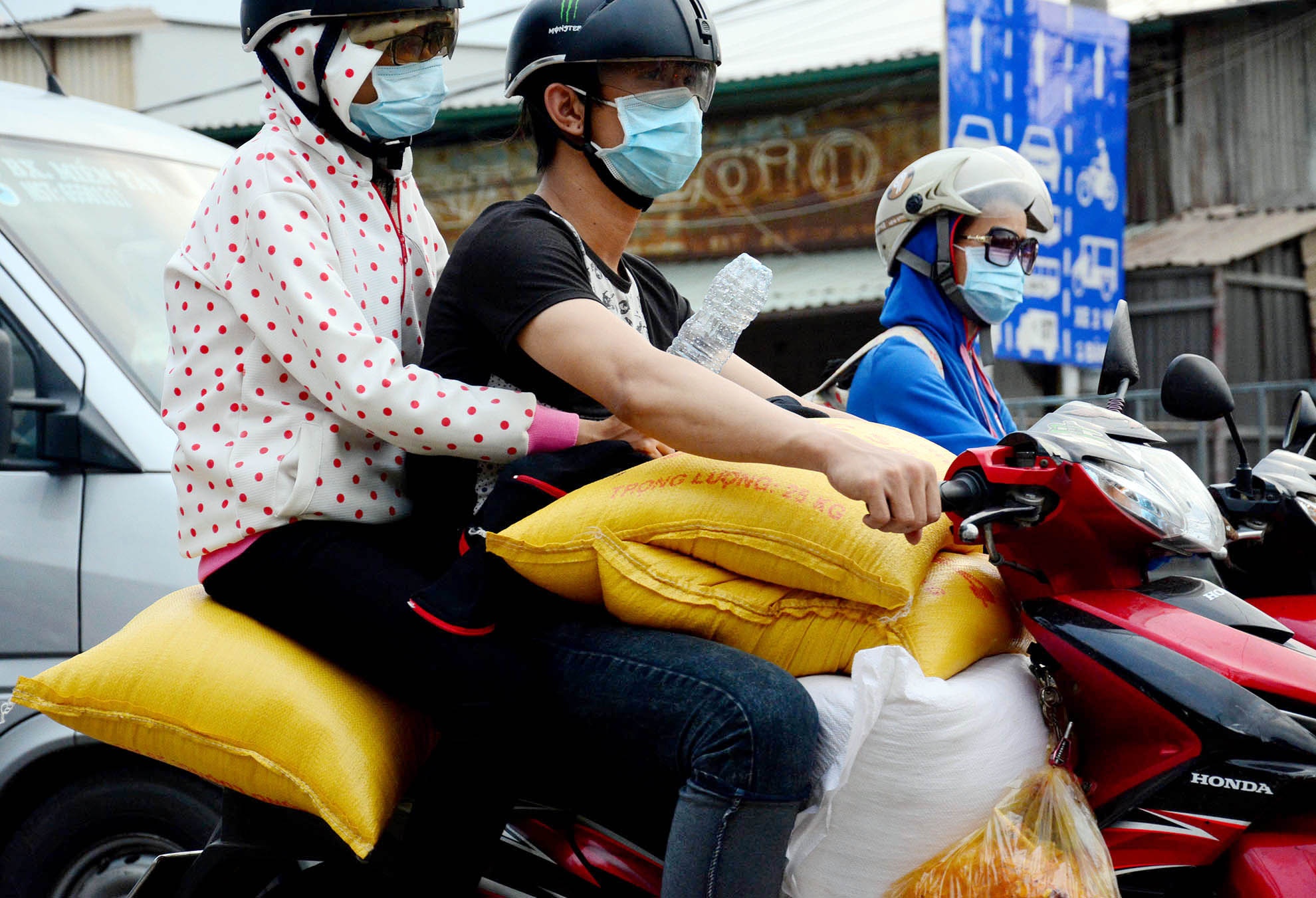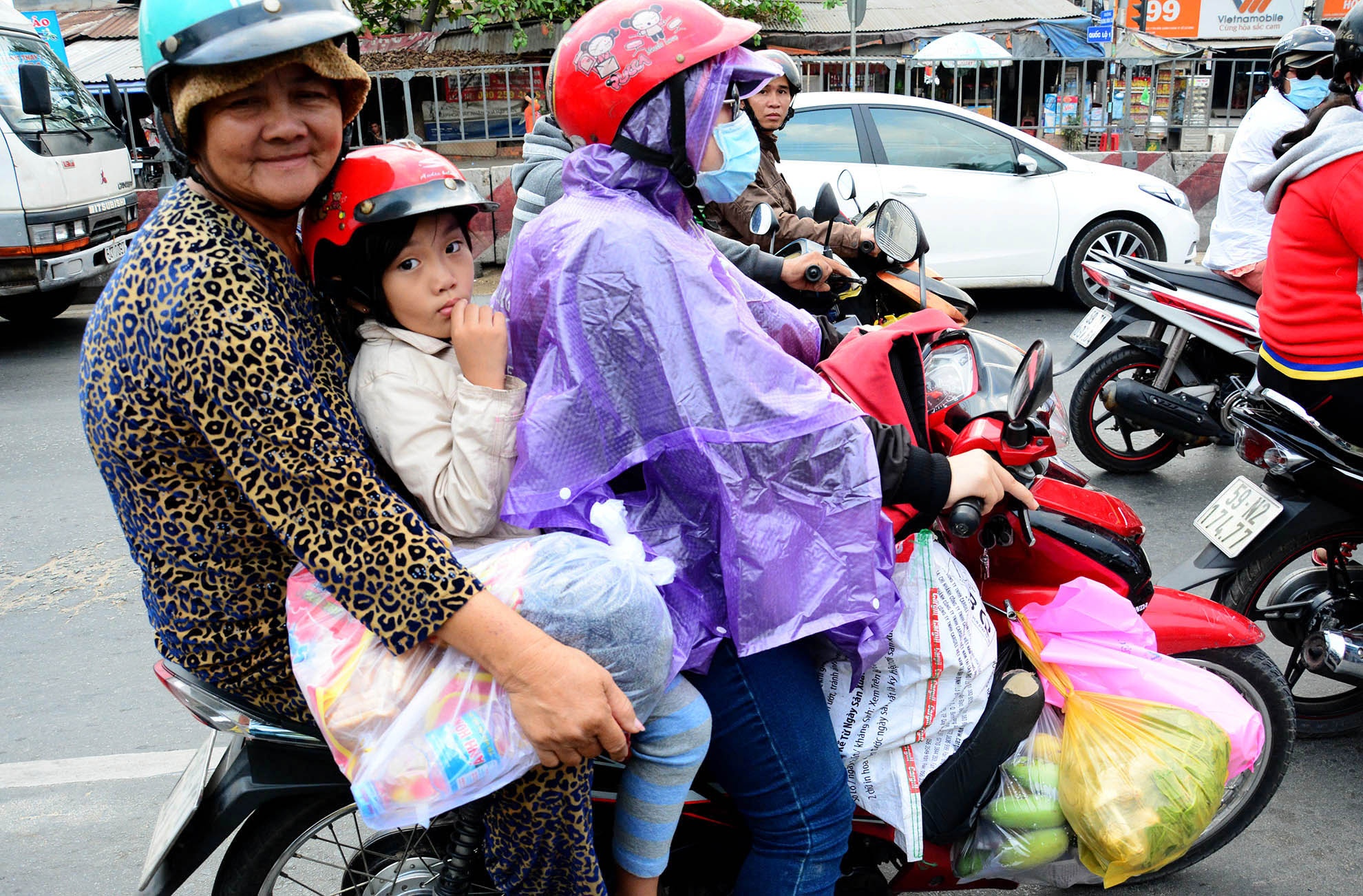 | Gia đình này có 4 thành viên từ Long An lên quận 12, TP HCM. Phía trước và sau xe họ treo nhiều loại quà quê. |
