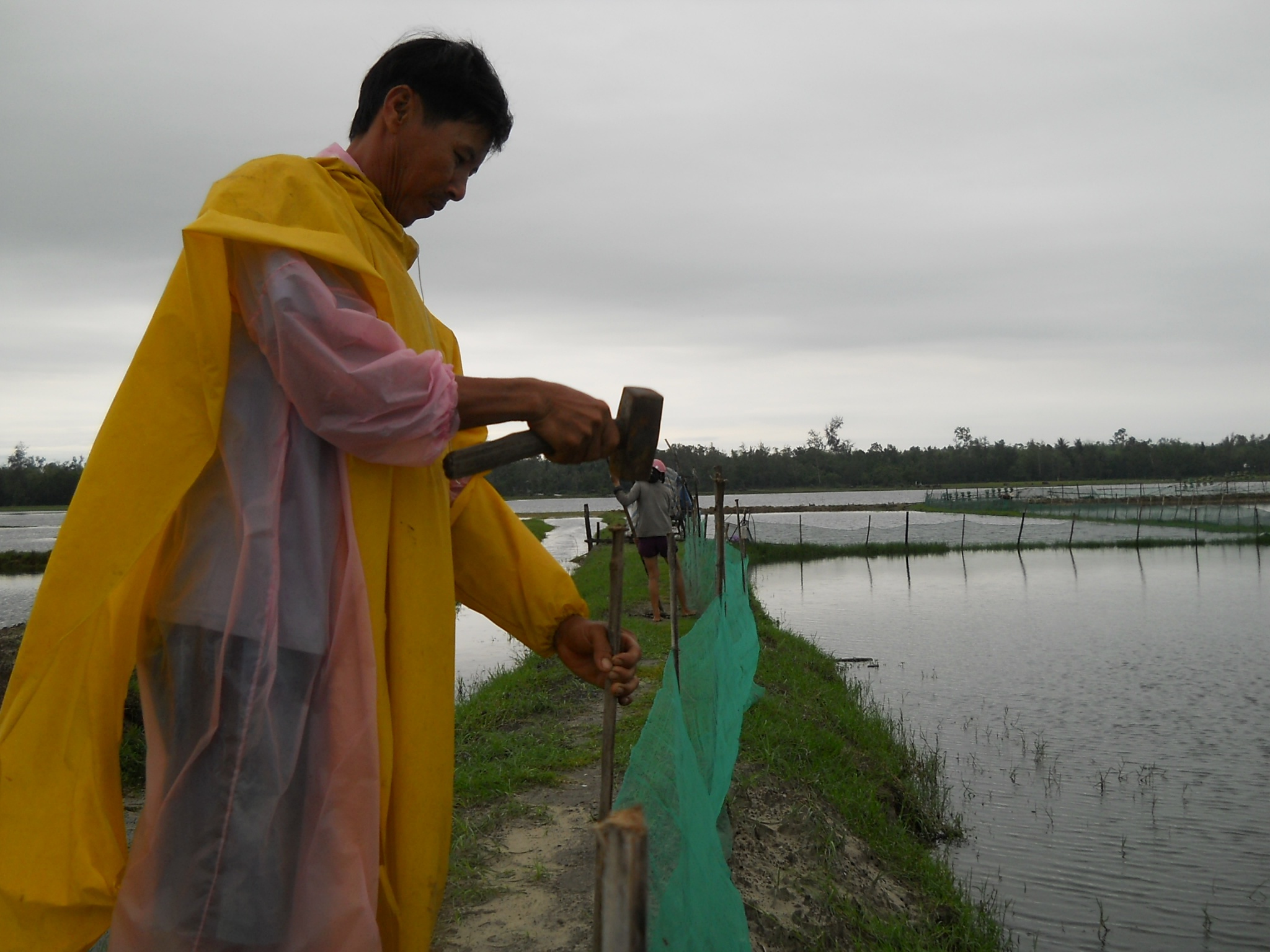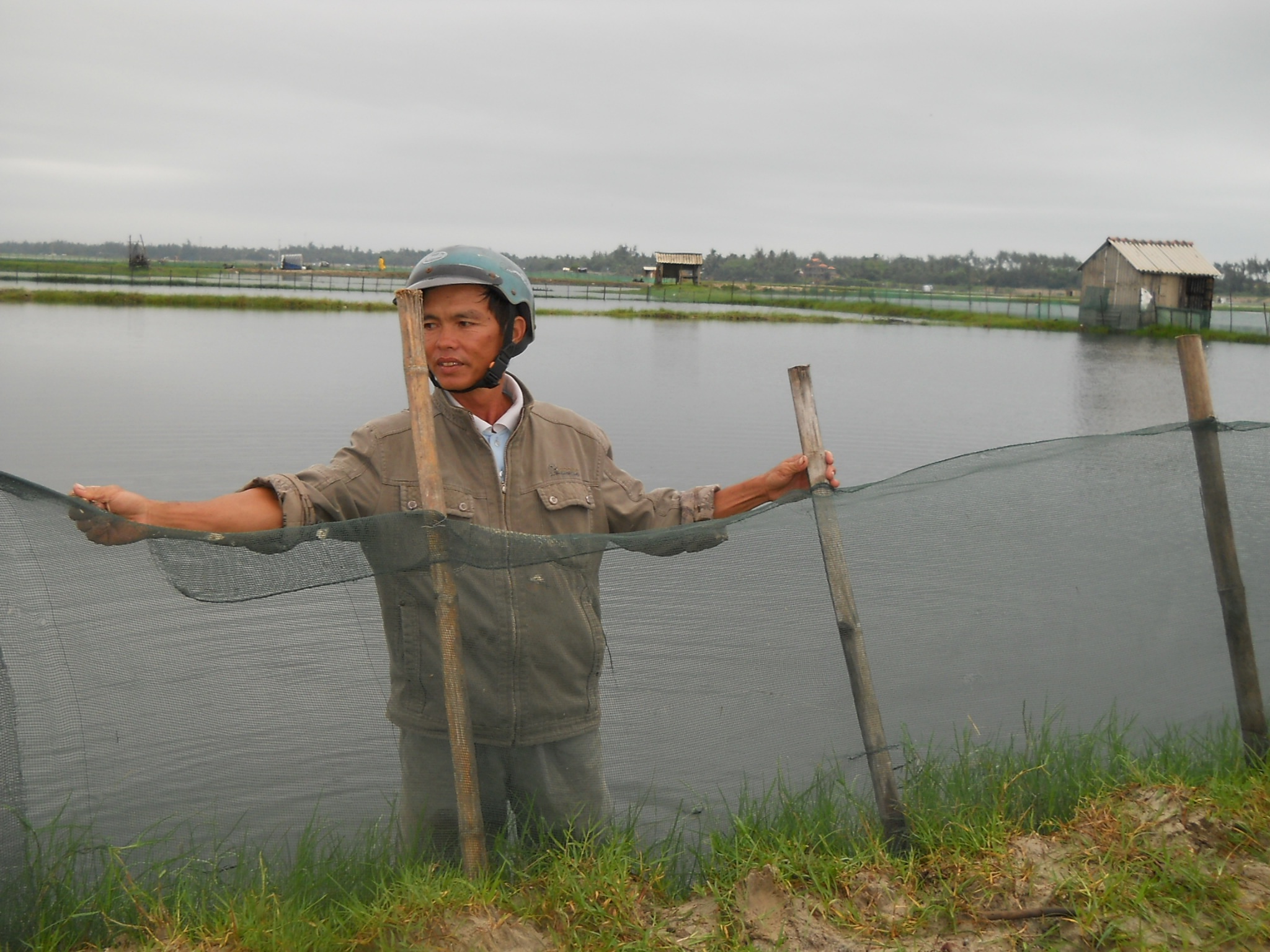 | Người dân kéo lưới bảo vệ các đìa nuôi tôm. |