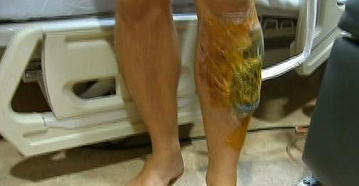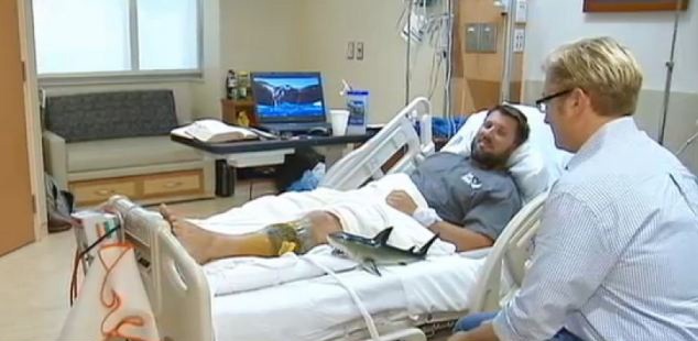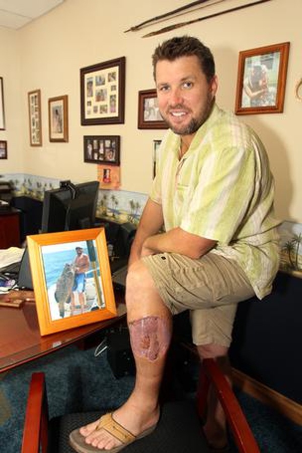 Phần chân của Norrie bị cá mập cắn. Norrie đến từ Largo, Florida. Anh có 4 người con. Khi cá mập tấn công anh, anh tưởng mình chết vì máu chảy quá nhiều. Ảnh: Fox29.