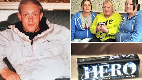 | Nạn nhân xấu số John Jackson (ảnh lớn), và gia đình cầm hộp kẹo nhãn hiệu Hero Instant Energy Mints (Ảnh: Mirror) |