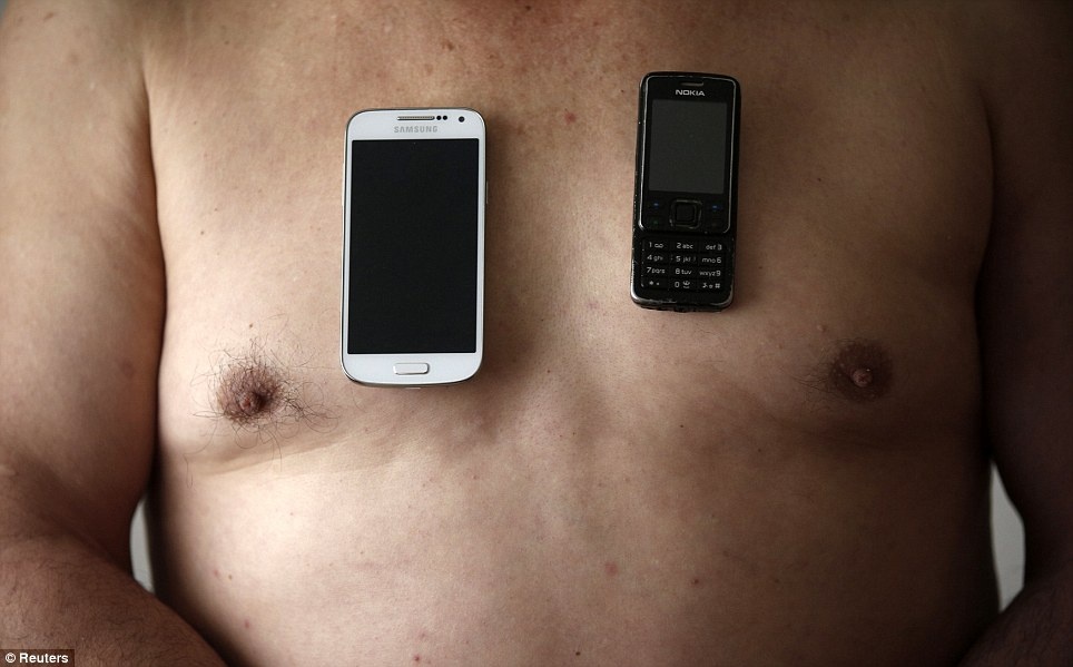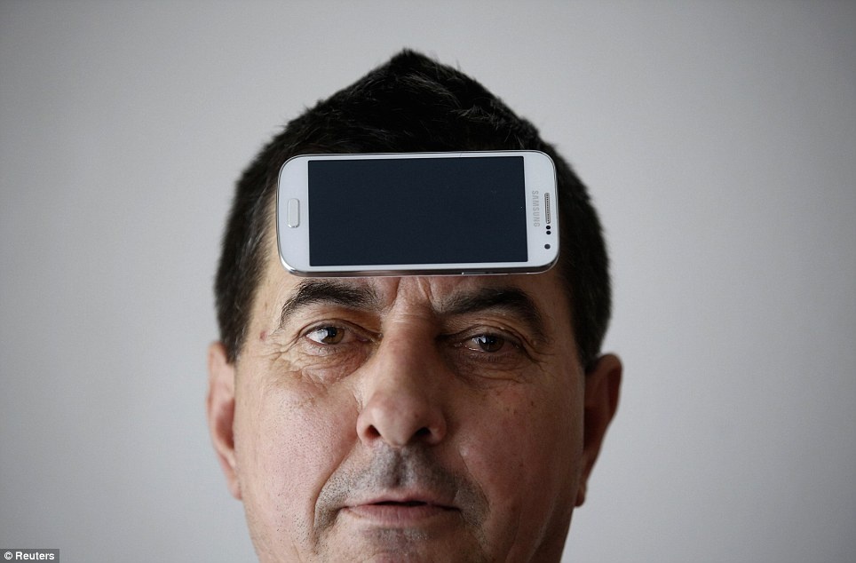 | Chiếc điện thoại bám chặt trên trán Muhibija Buljubasic. |