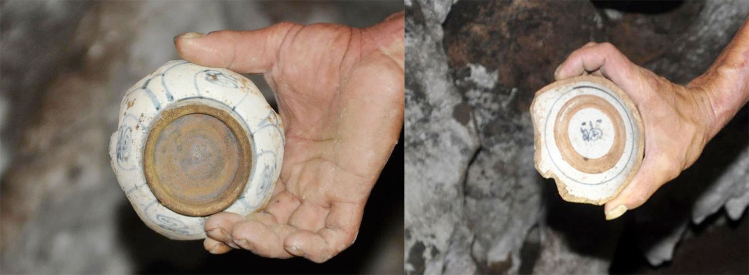 Vừa bước được hai bước, ông Nam vấp phải một vật gì đó rất cứng khiến người ngã bổ nhào. Rọi đuốc xuống, ông thấy một phiến đá hình vuông, cạnh khoảng 30 cm có ba dòng chữ nho, bên cạnh có hai chiếc bát gốm men màu xanh dương rất đẹp. Mọi người cho rằng đây rất có thể là gia phả ghi chép thông tin về kho báu trong hang.