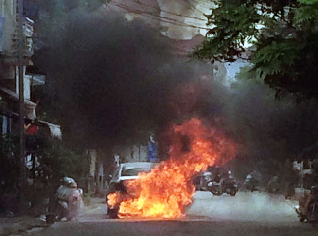| Chiếc Sonata bốc cháy dữ dội. Ảnh: Công Nguyễn. |