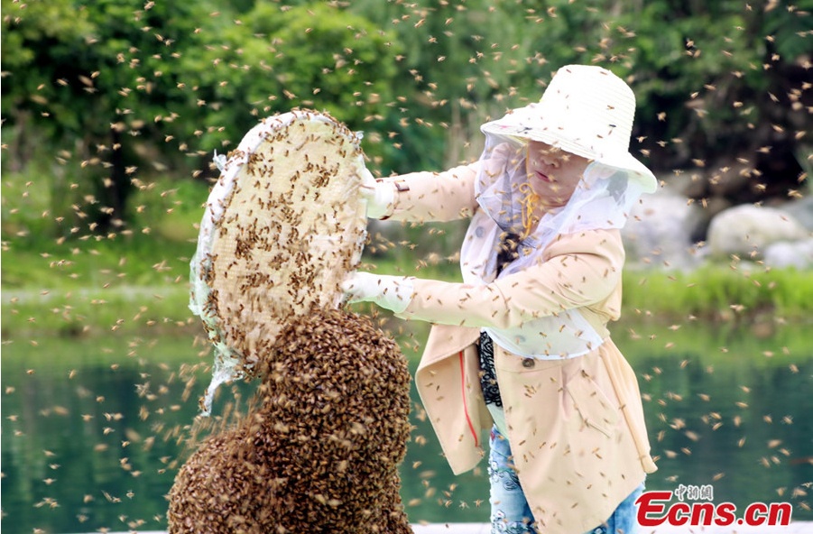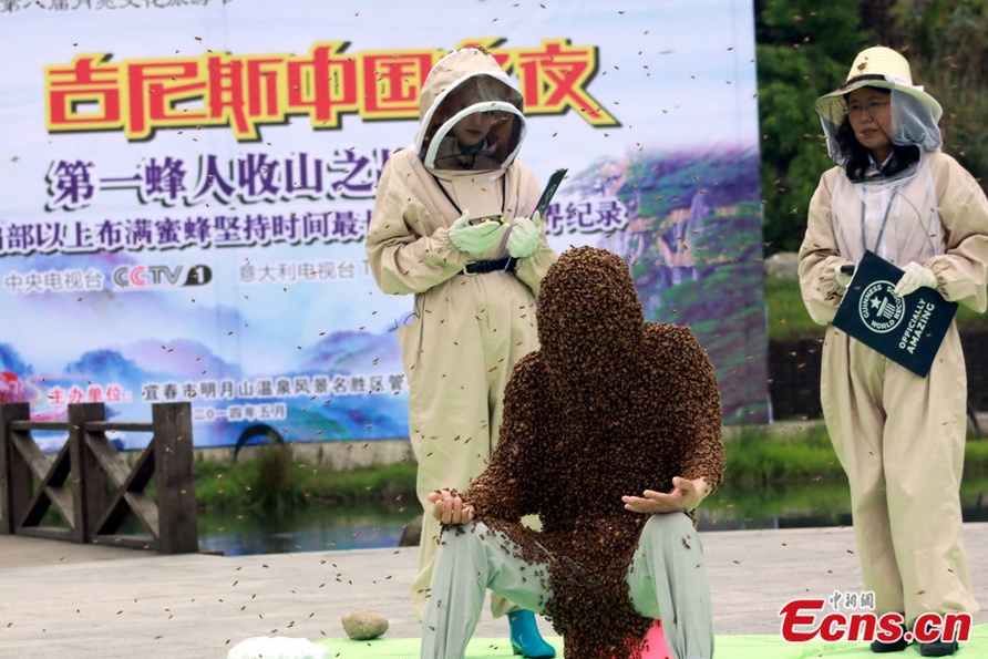 | Một người hỗ trợ Ruan bằng cách đổ thêm ong lên cơ thể anh. Ảnh: ECNS |