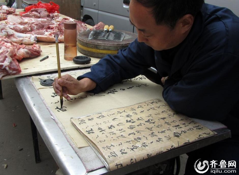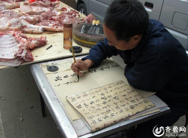Người đàn ông vừa bán thịt lợn vừa viết thư pháp