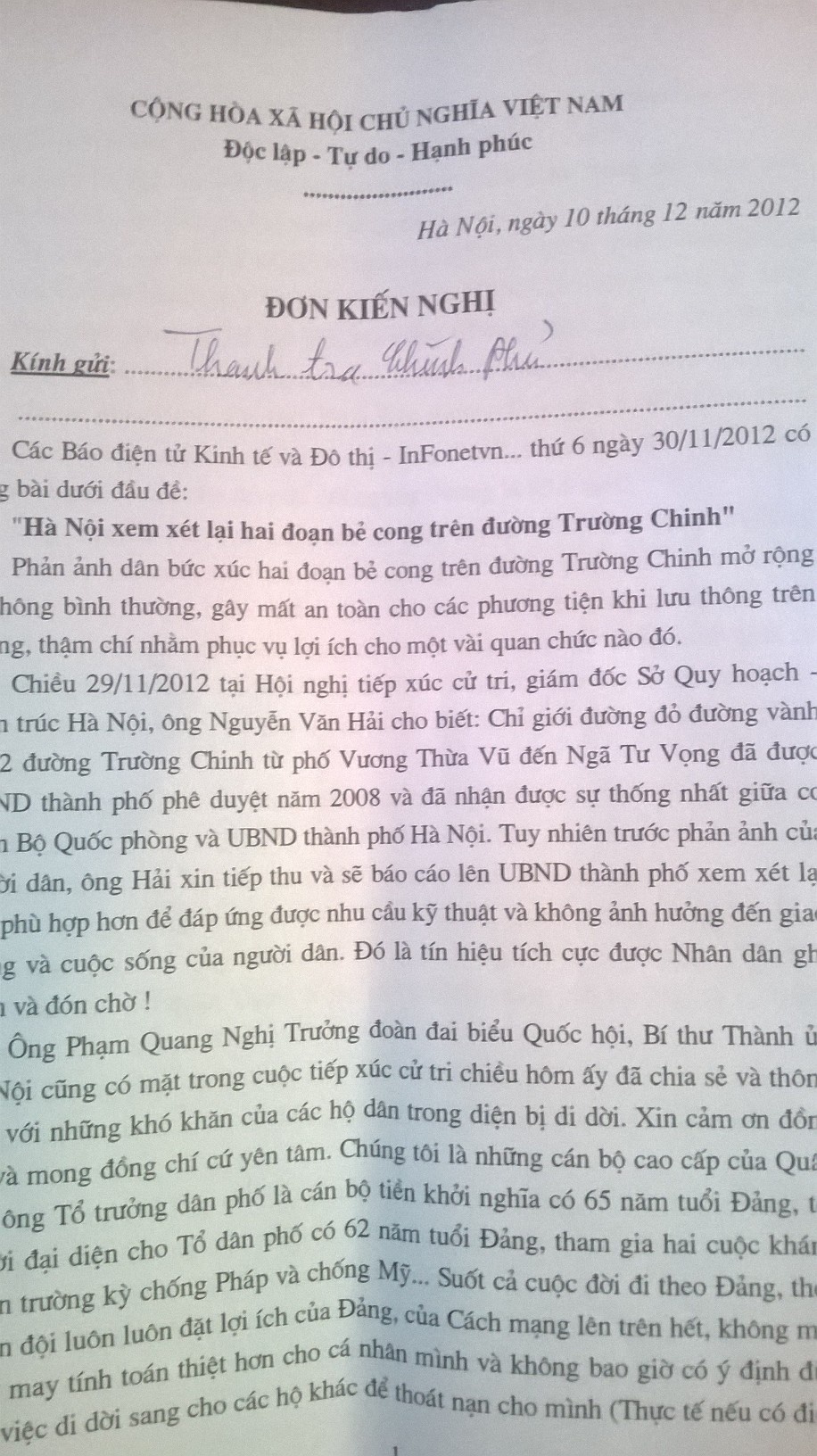 | Lá đơn kiến nghị TTCP về việc nắn đường Trường Chinh được gửi từ tháng 12/2012. |
