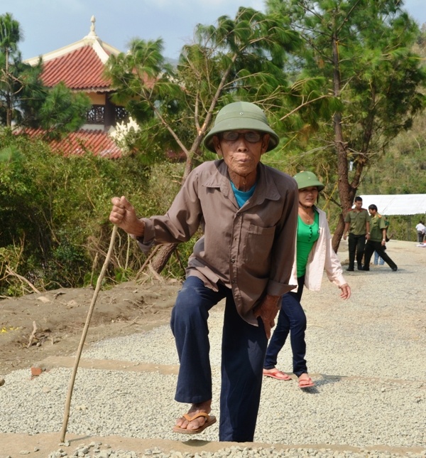| Cụ Tưởng Đỉnh, 86 tuổi vẫn cố gắng chống gậy leo lên núi để được viếng mộ Đại tướng. Cụ cho biết hôm qua người đông cụ không đi thăm Đại tướng được, sáng nay phải gắng sức lên thăm bằng được. |