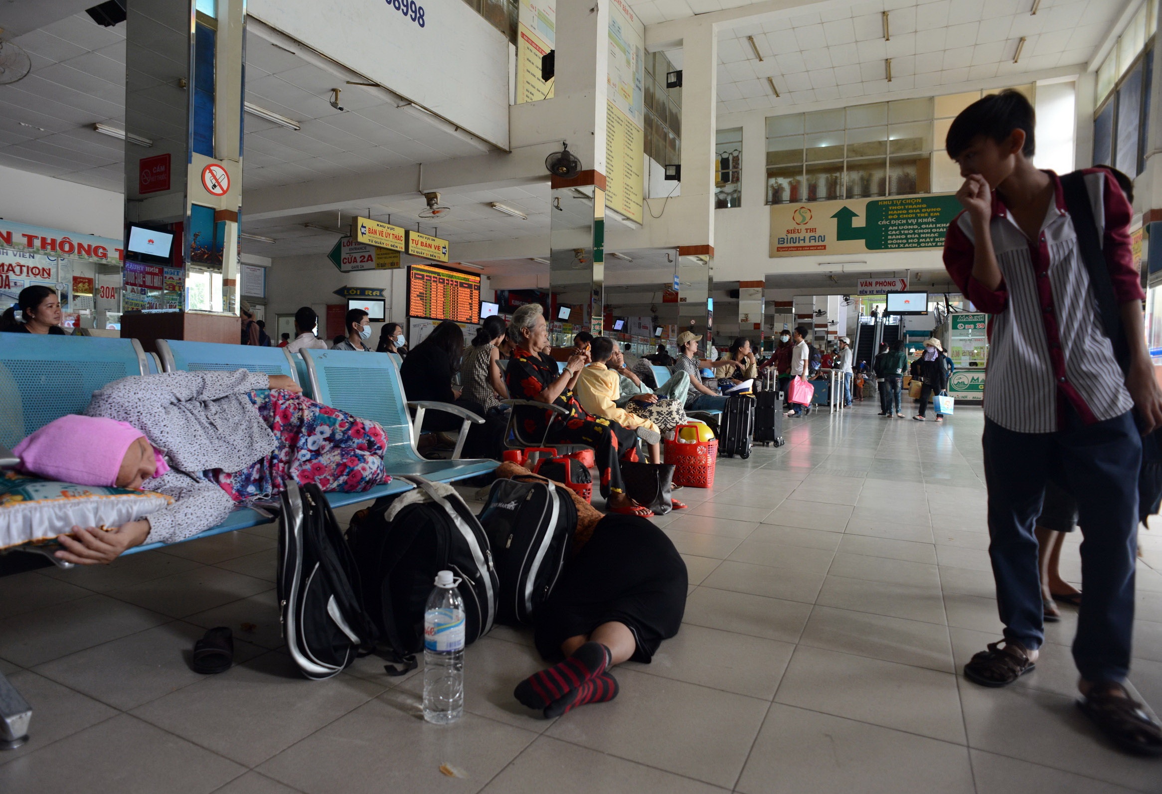 | Bà Trà (59 tuổi) và bà Binh (65 tuổi), quê huyện Ninh Phước, Ninh Thuận nằm mệt mỏi giữa bến xe. Hai bà đi chữa bệnh vừa được bệnh viện cho về đúng vào dịp lễ giá vé tăng nên phải nằm chờ vé xe giảm mới có thể mua được. |