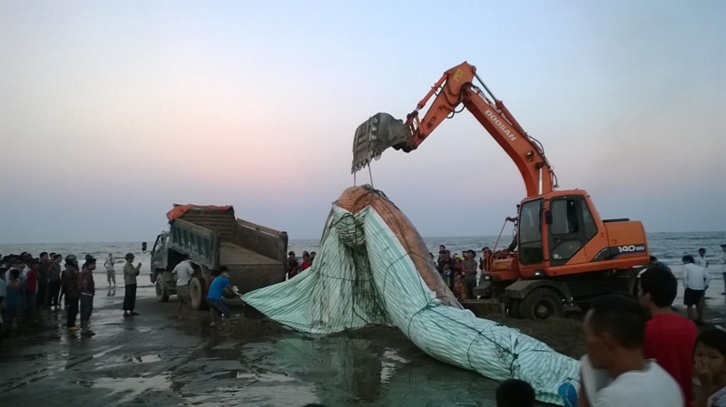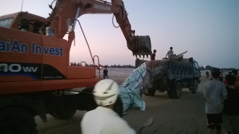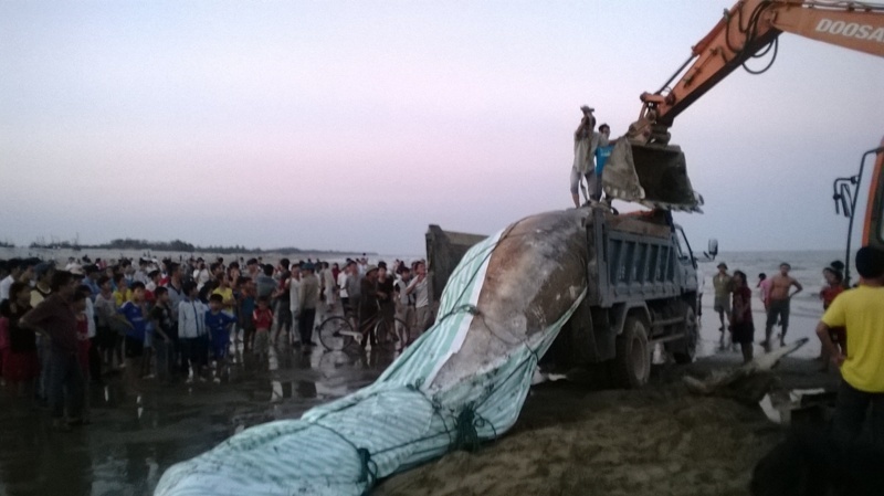 | Cuối giờ chiều, sau nhiều nỗ lực, xác cá voi đã được đưa lên xe hướng về nghĩa trang để chôn cất. Dự kiến, một miếu thờ cá voi sẽ được người dân lập nên tại đây. |