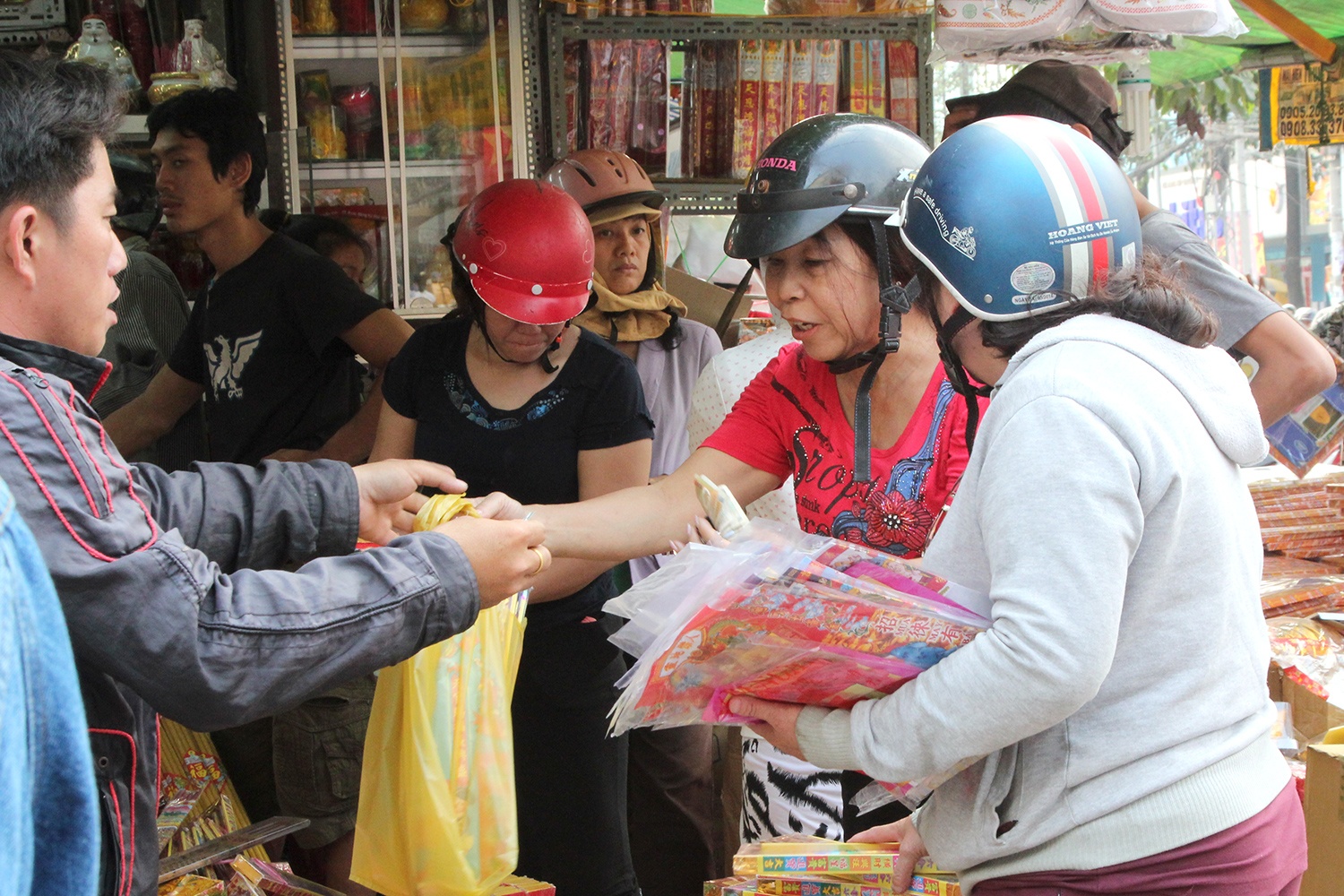 | Các cửa hàng vàng mã khu vực chợ Bình Tây, quận 6 tấp nập người mua. |