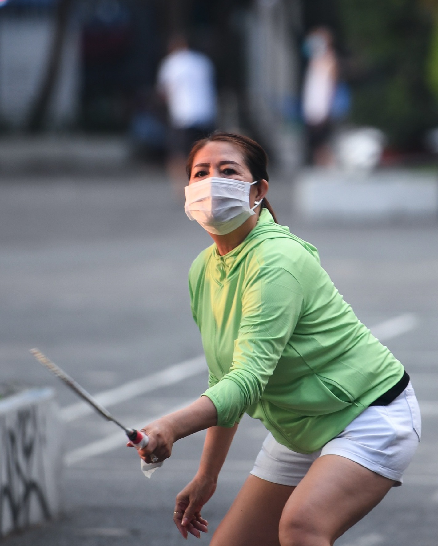 | Tại công viên 23/9, người dân đến tập thể dục đều đeo khẩu trang. |